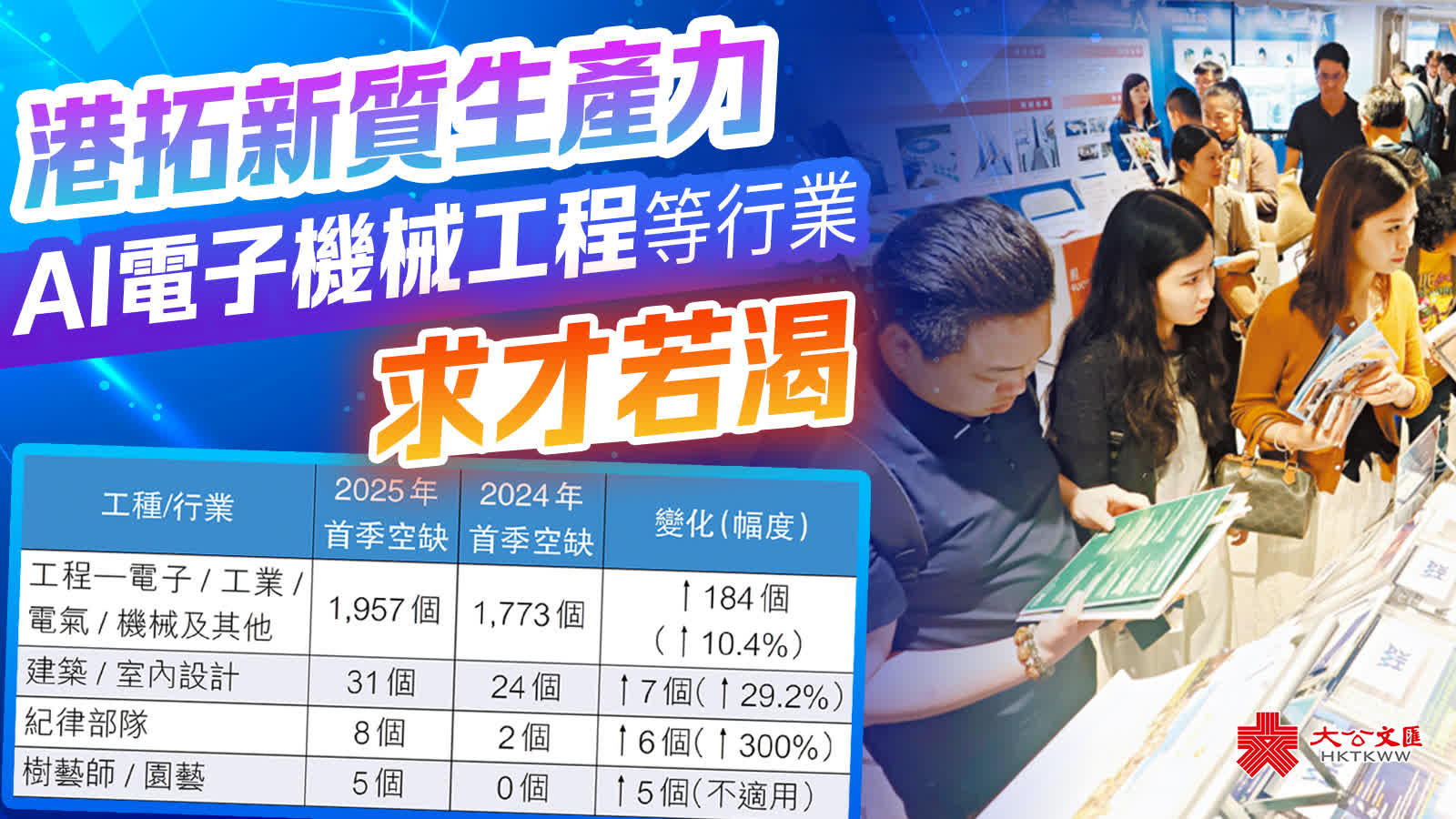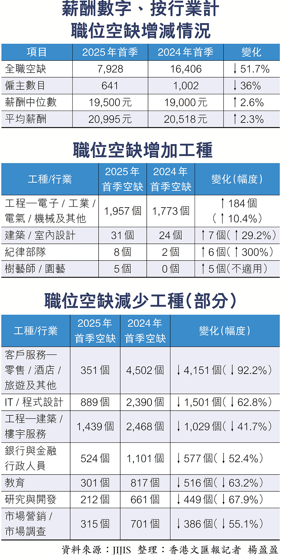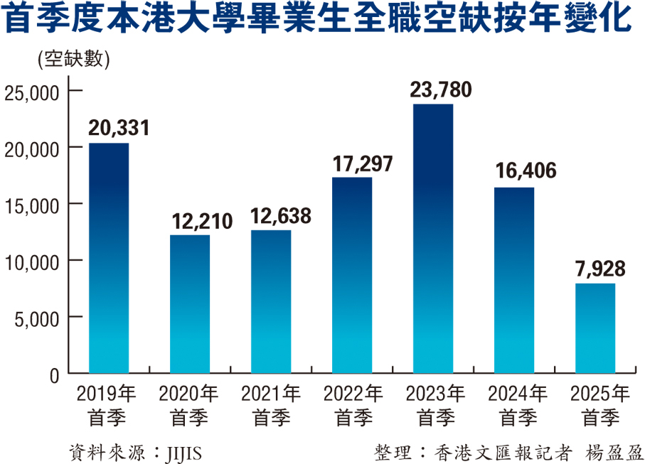 (香港文匯報 記者 楊盈盈)踏入大學畢業季節,不少大學生忙於搵工,在當前國際政治環境及關稅貿易爭端下,經濟未明朗,影響就業市場。香港文匯報取得大學聯校就業資料庫(JIJIS)的最新數字顯示,今年1月至3月提供予本港大學畢業生的全職空缺有7,900多個,雖然較去年同期減少,但薪酬卻微增2%,在香港創科AI (人工智能)發展勢頭下,與電子、工業、電氣及機械工程相關的職位空缺逆市增加一成,相關人才相當搶手,凸顯香港發展新質生產力與人才的重要關聯。有學者專家指出,今年首季本港整體經濟及就業仍屬穩定,數字更多是說明僱主對前景抱觀望,因而延後招攬新人,估計隨着各地應對貿易戰的政策方向逐漸明朗,今年底前就業市場或會回暖。