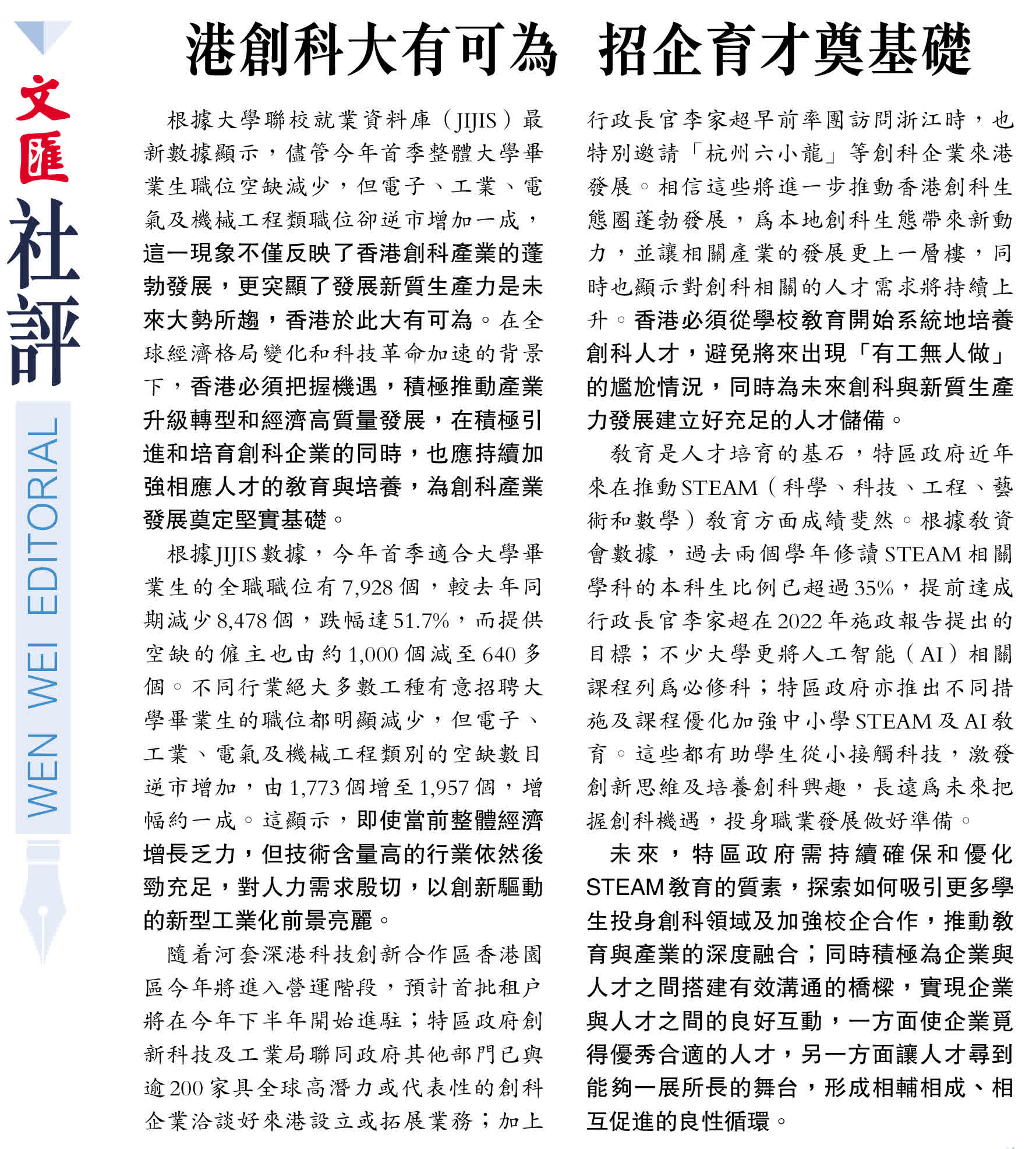 根據大學聯校就業資料庫(JIJIS)最新數據顯示,儘管今年首季整體大學畢業生職位空缺減少,但電子、工業、電氣及機械工程類職位卻逆市增加一成,這一現象不僅反映了香港創科產業的蓬勃發展,更突顯了發展新質生產力是未來大勢所趨,香港於此大有可為。在全球經濟格局變化和科技革命加速的背景下,香港必須把握機遇,積極推動產業升級轉型和經濟高質量發展,在積極引進和培育創科企業的同時,也應持續加強相應人才的教育與培養,為創科產業發展奠定堅實基礎。