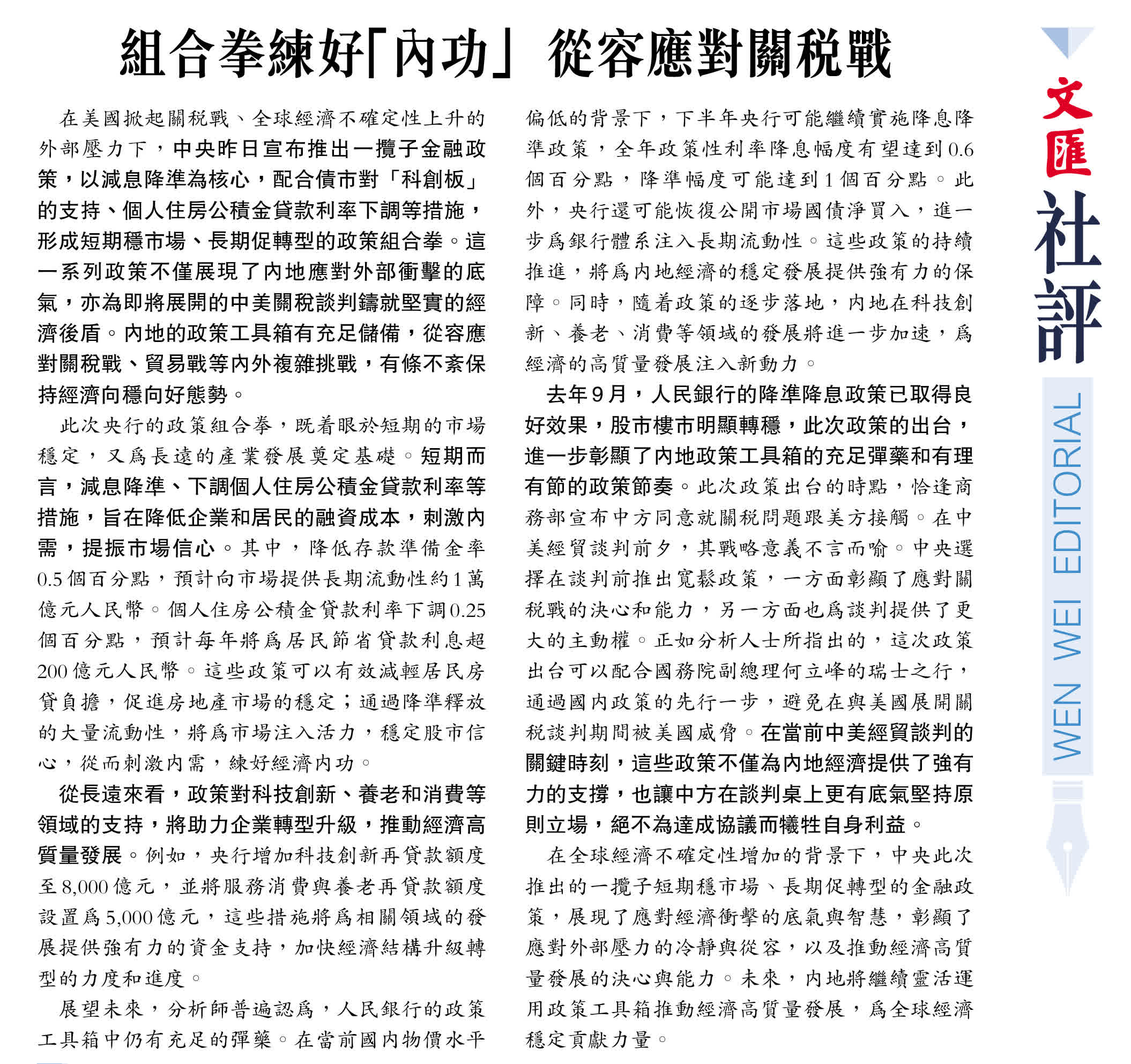 在美國掀起關稅戰、全球經濟不確定性上升的外部壓力下,中央昨日宣布推出一攬子金融政策,以減息降準為核心,配合債市對「科創板」的支持、個人住房公積金貸款利率下調等措施,形成短期穩市場、長期促轉型的政策組合拳。這一系列政策不僅展現了內地應對外部衝擊的底氣,亦為即將展開的中美關稅談判鑄就堅實的經濟後盾。內地的政策工具箱有充足儲備,從容應對關稅戰、貿易戰等內外複雜挑戰,有條不紊保持經濟向穩向好態勢。