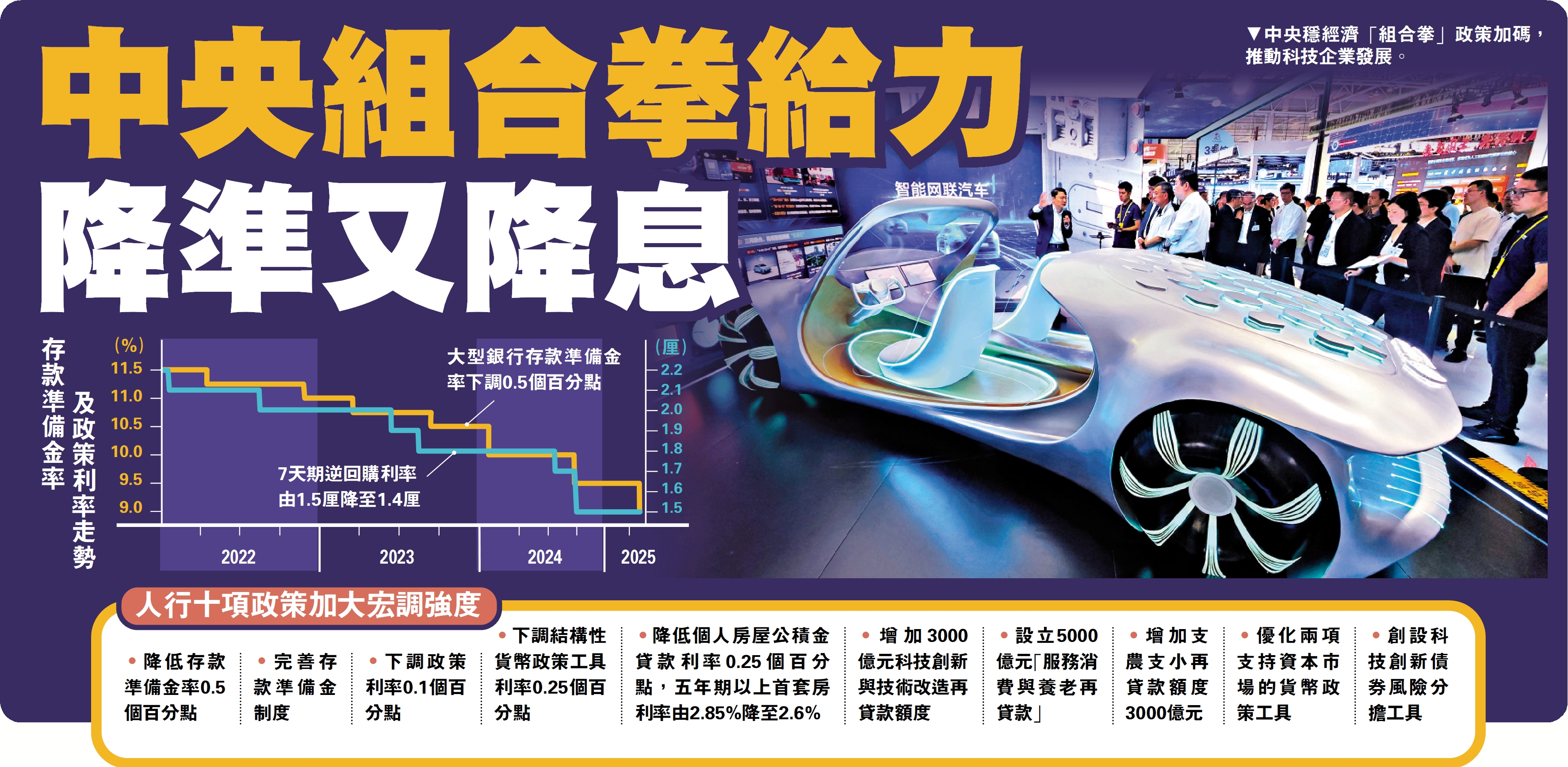 (大公報 記者 李暢)中央穩經濟「組合拳」政策加碼,人民銀行、金融監管總局、中證監昨日聯合公布一攬子合共43項利好措施。其中,人行宣布降準0.5個百分點,向市場釋出1萬億元人民幣流動性。同時下調多項政策利率。人行行長潘功勝表示,新措施有利提振市場信心,支持實體經濟穩定增長,未來還可以擴大工具規模,以及創設新的政策工具。