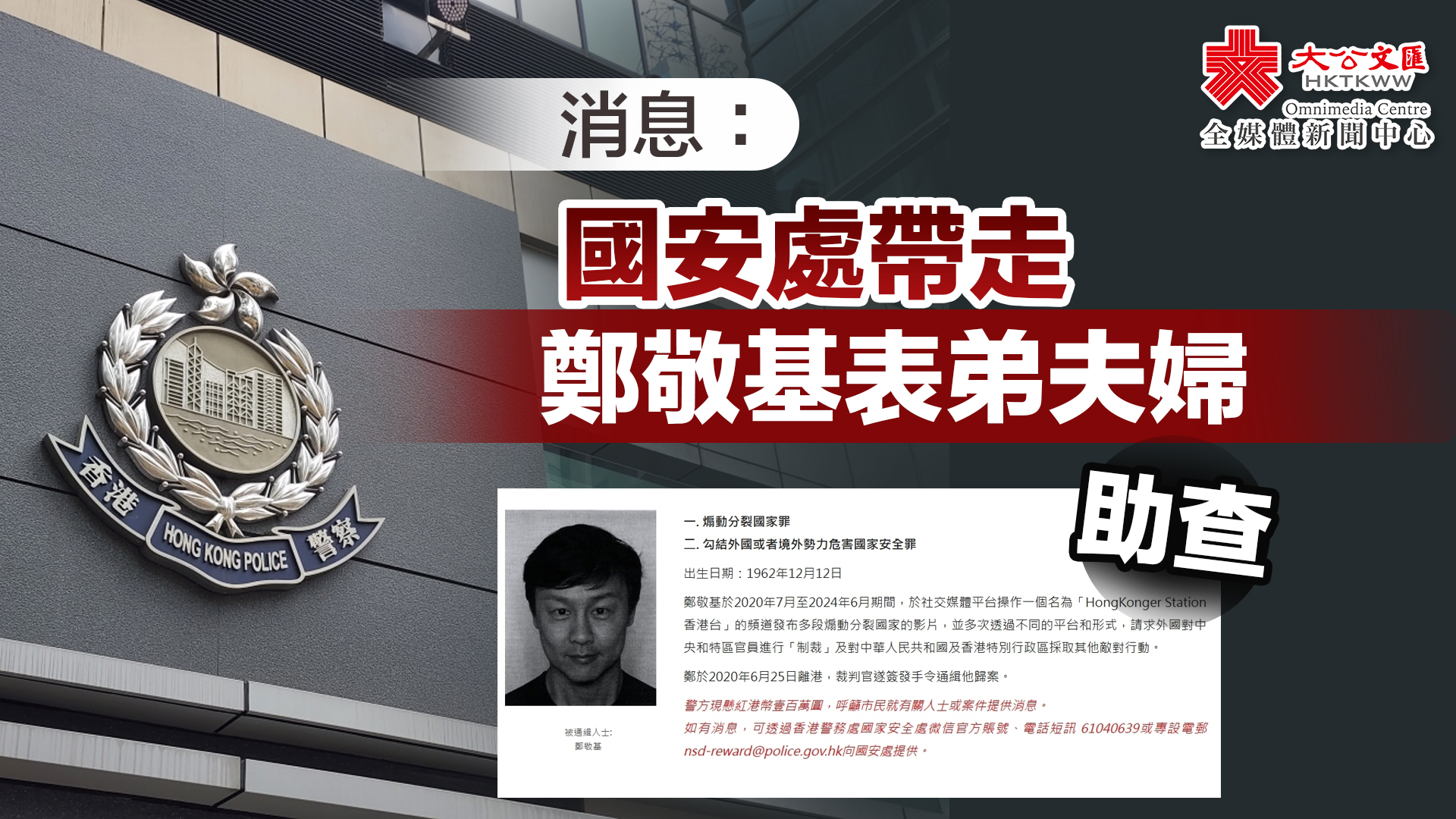 大公文匯全媒體報道,藝人鄭敬基涉嫌「煽動分裂國家罪」及「勾結外國勢力罪」,於2024年12月被警方通緝,據傳媒消息指,鄭敬基表弟及表弟婦今(8日)早7時許在火炭住所中,被警方國安處人員帶返警署協助調查。