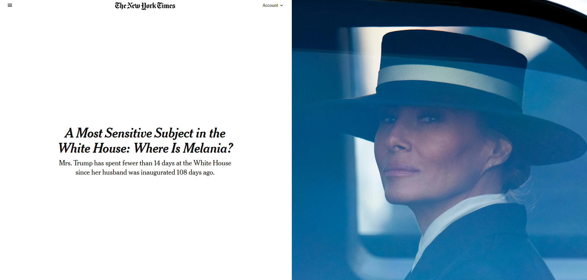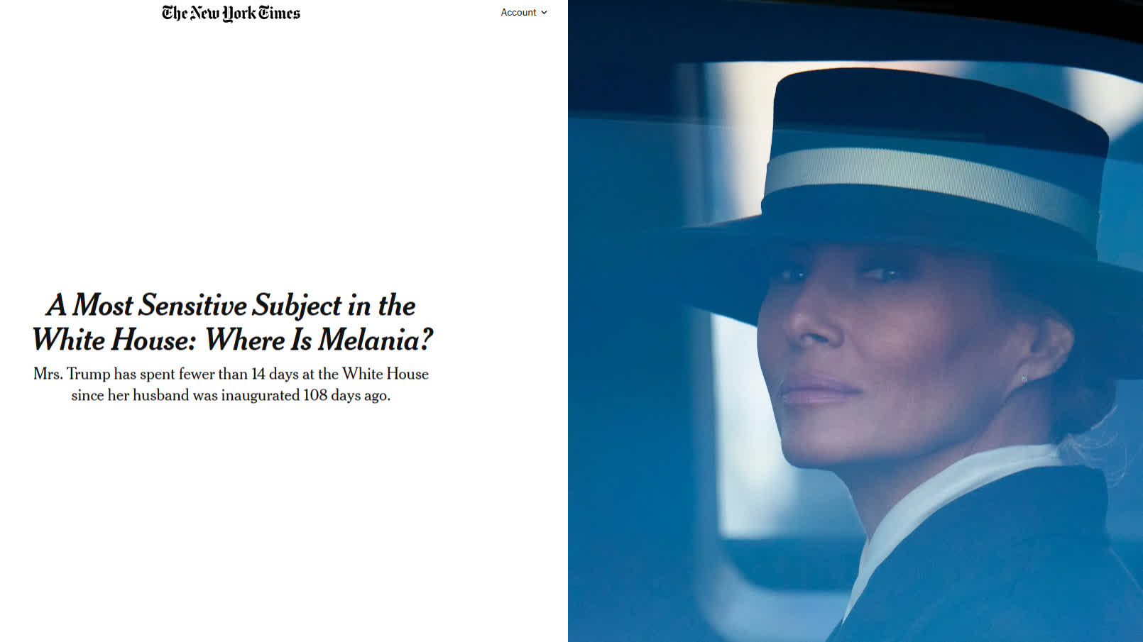 紐約時報稱,梅拉尼婭有時會消失數周之久,躲在曼哈頓的特朗普大廈或佛羅里達的海湖莊園。政府官員表示,她出現在白宮的次數比公眾所知的要多,但具體何時出現,以及持續多久,則未有透露。