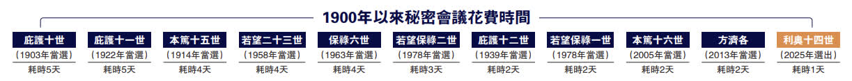 利奧十四世是自1900年以來,第五位在秘密會議兩天內選出的教皇。當地時間8日晚7時許(本港時間9日凌晨1時許),執事級首席樞機、法國人曼貝蒂在陽台上宣布「我們有教皇了(Habemus Papem)!」並介紹新教皇的名號「利奧十四世」。新教皇隨後首次向全世界發表講話,並頒賜他的第一個宗座降福──「降福羅馬城和全世界(Urbi et Orbi)」。