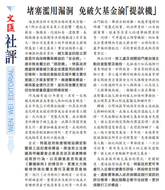 海皇粥店昨日突然全線結業及清盤,共7間分店逾百名員工受影響,遭拖欠薪金、強積金、代通知金、遣散費、長期服務金及假期等涉款總數逾3百多萬元,惟公司竟着員工就申請破產欠薪保障基金(破欠基金)事宜諮詢勞工處,涉嫌推卸應有責任。破欠基金的設立原意是作為保障僱員權益的「安全網」,絕非無良僱主的「提款機」。特區政府應盡快堵塞破欠基金或遭濫用的漏洞,從修例、加強巡查檢控及提升僱主責任意識三方面多管齊下,維護僱員權益,確保基金運作正常,並向其他僱主發出切勿依樣畫葫蘆的明確信號。
