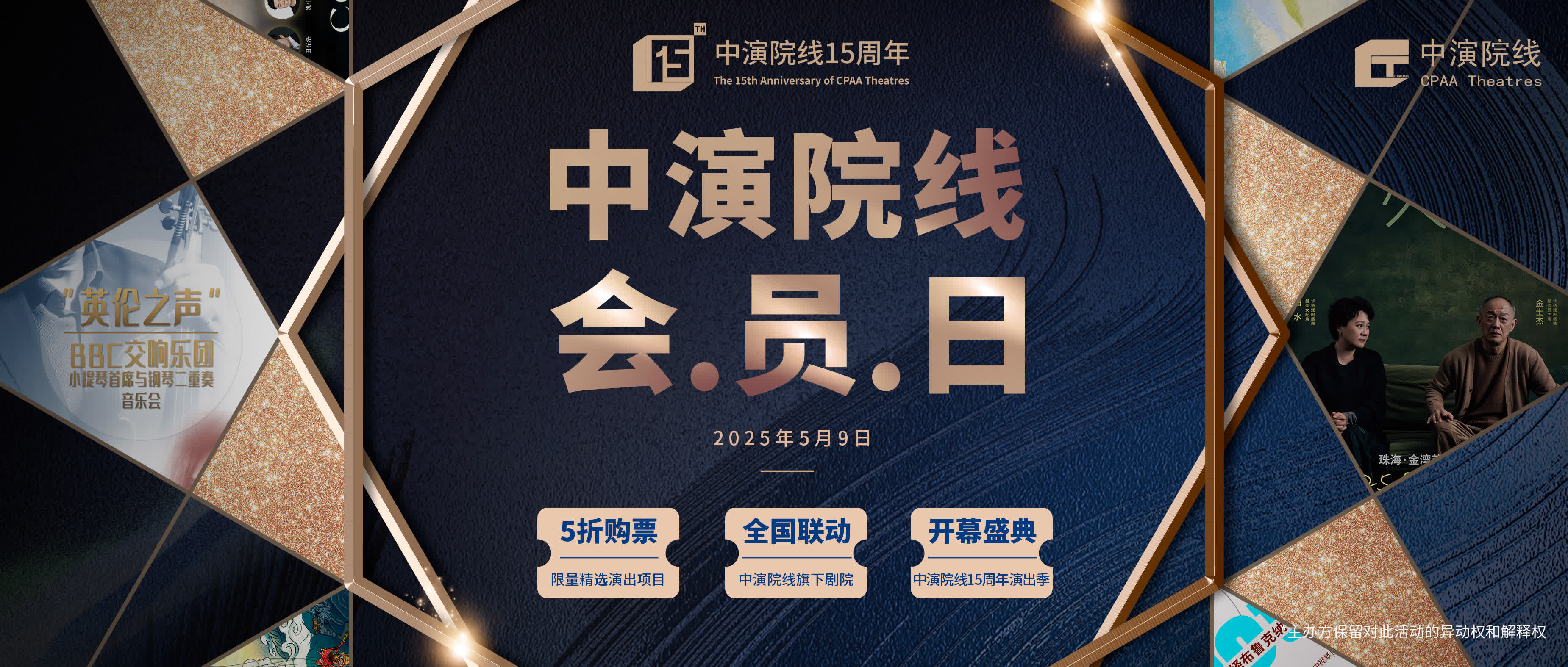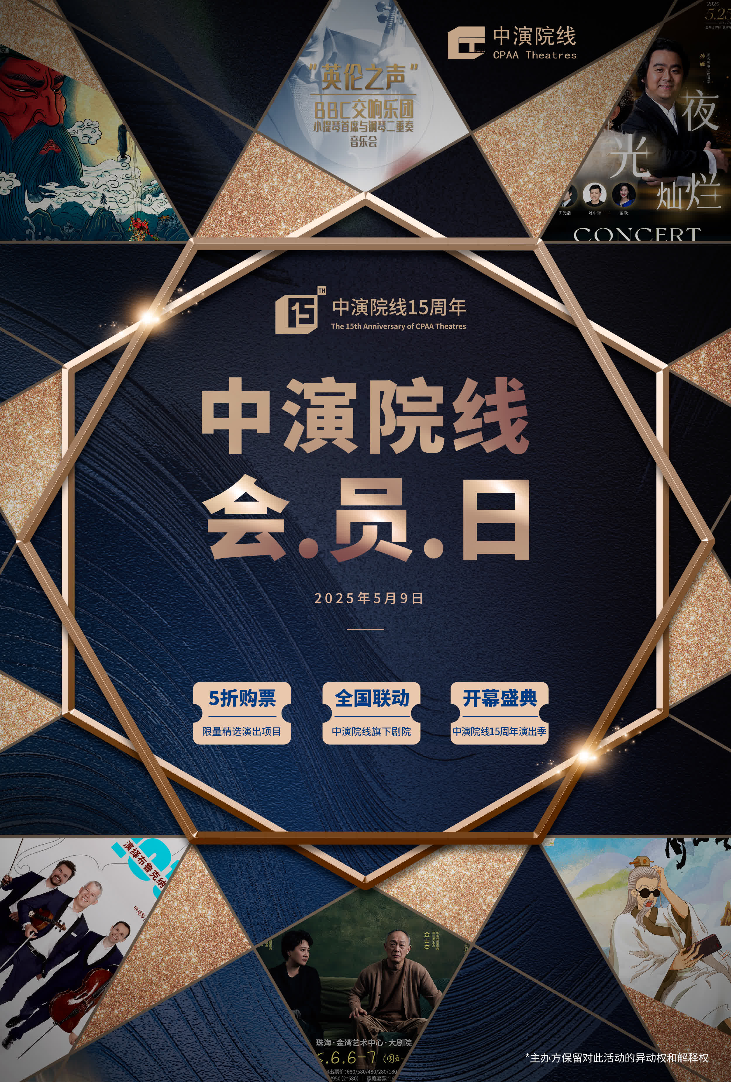 中演院線15周年演出季於5月9日持續至9月30日,呈現30餘台中外精品佳作,涵蓋話劇、舞劇、音樂會等各類藝術形式。從廣州大劇院到上海大寧劇院、深圳濱海藝術中心、北京順義大劇院,再到佛山大劇院、廈門閩南大戲院、泉州大劇院、德州大劇院、成都高新中演大劇院等覆蓋全國12個城市的中演院線15周年演出季為全國觀眾帶來一場為期近五個月的多彩藝術盛宴,呈現豐富生動的文藝現場。其中,5月9日作為中演院線15周年慶的正日,本年度以「中演院線會員日」重磅活動推出。
