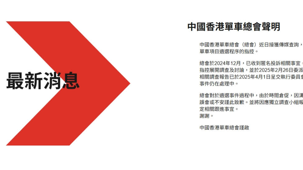 總會表示,於去年12月已收到匿名投訴相關事宜,總會執行委員會亦已就指控展開調查及討論,並於今年2月26日委派獨立調查小組進行調查,相關調查報告已於上月1日呈交執行委員會及港協暨奧委會審閱,事件仍在處理中。