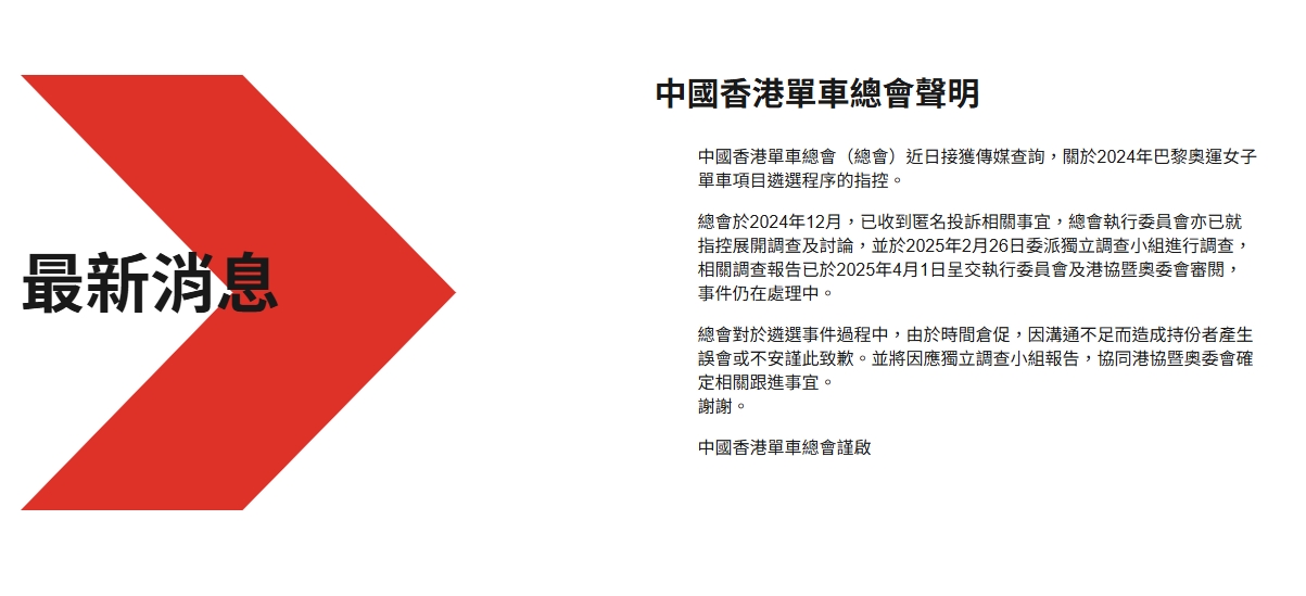 大公文匯全媒體報道,此前有報道指,中國香港單車總會主席梁鴻德於去年巴黎奧運選拔期間,曾要求港隊運動員以「讓位」及「詐病」的方式,讓多一名運動員可以出戰奧運。中國香港單車總會今日(9日)表示,對於遴選事件過程中,由於時間倉促,因溝通不足而造成持份者產生誤會或不安致歉。
