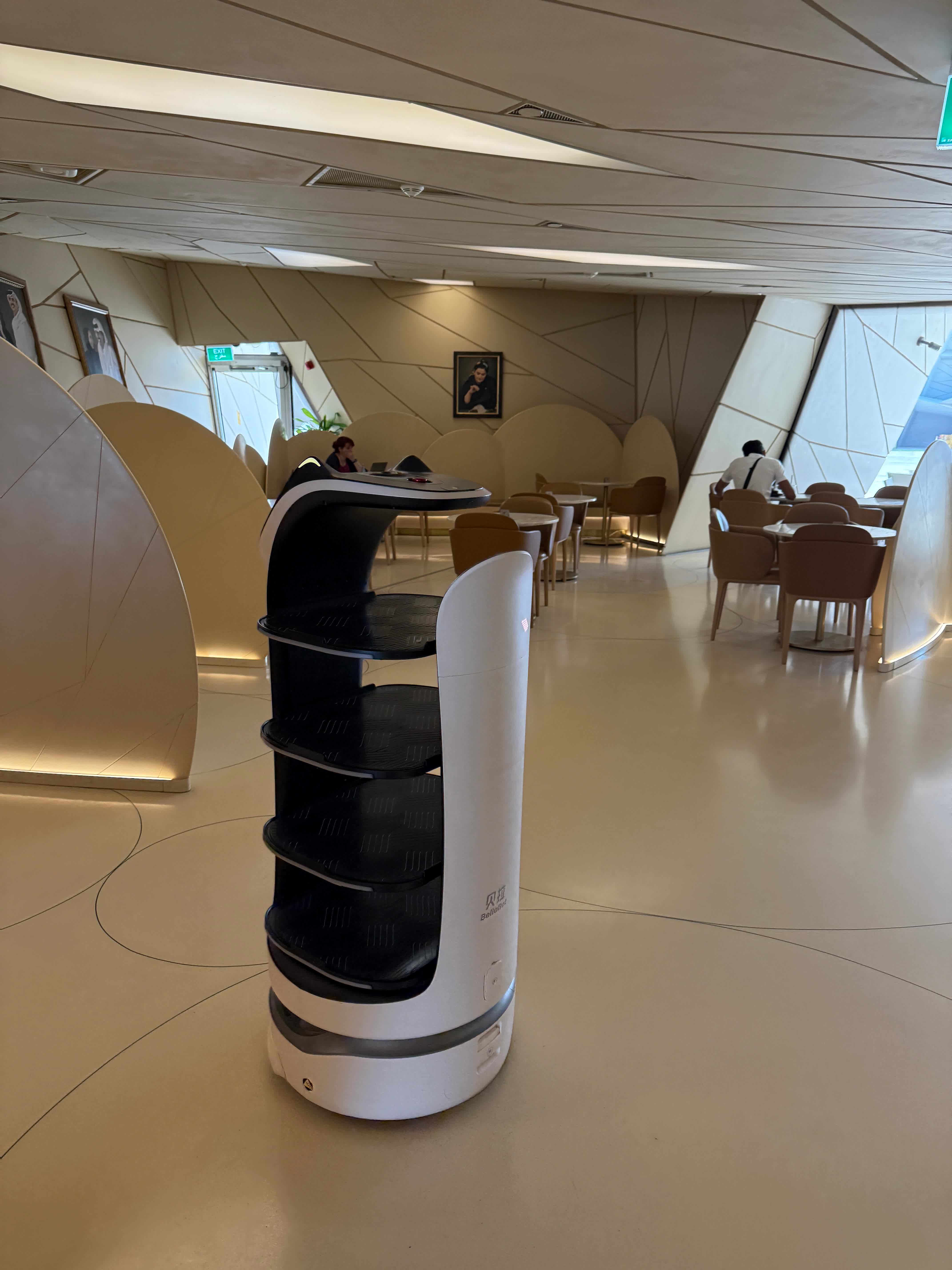 在多哈的街頭巷尾,中國科技的影子無處不在。餐館內,我用手機掃碼點餐,界面熟悉得像是回到了國內。送餐的機器人緩緩滑過,機身上赫然印着「貝拉」(中國的端菜服務機器人品牌)字樣,街頭的監控攝像頭,商場的電子顯示屏,處處都能看到中國品牌的痕跡。這些細節讓我感到親切,也感慨中國製造在全球的影響力。