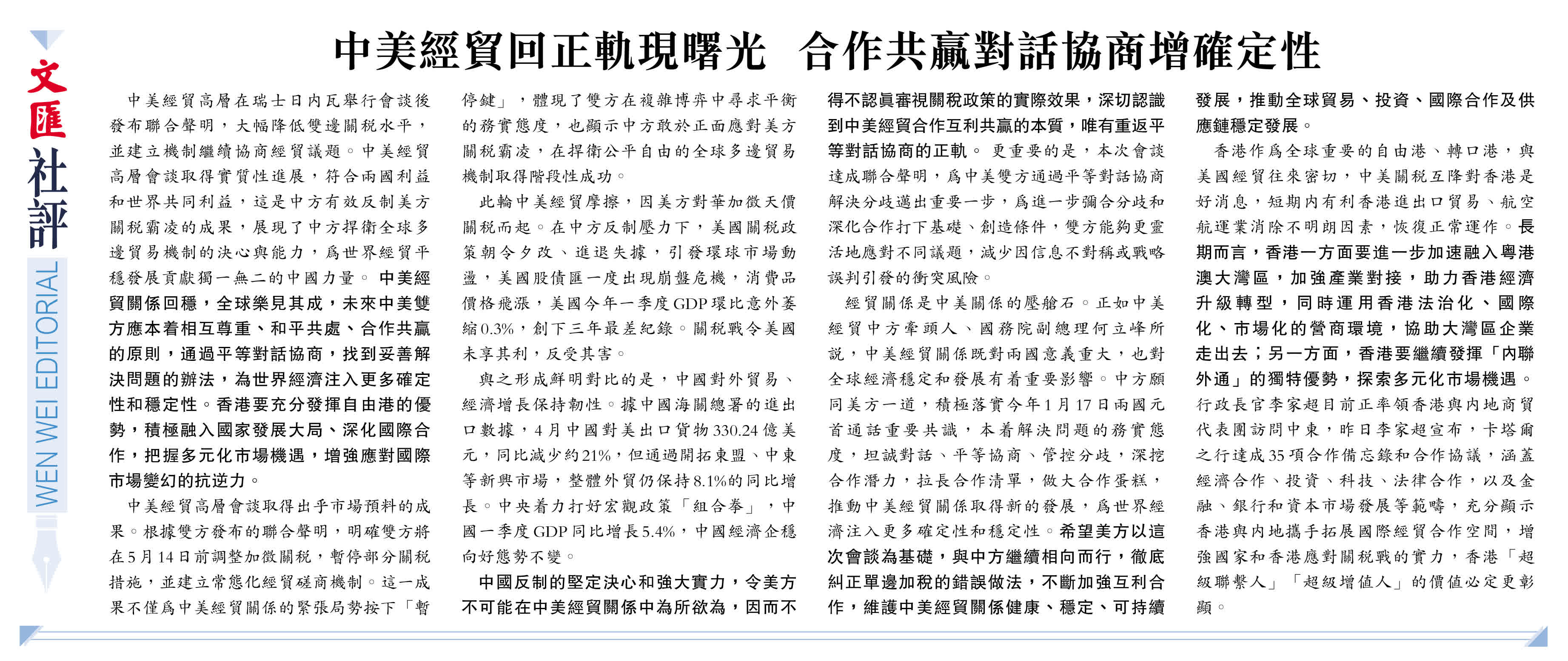 中美經貿高層在瑞士日內瓦舉行會談後發布聯合聲明,大幅降低雙邊關稅水平,並建立機制繼續協商經貿議題。中美經貿高層會談取得實質性進展,符合兩國利益和世界共同利益,這是中方有效反制美方關稅霸凌的成果,展現了中方捍衛全球多邊貿易機制的決心與能力,為世界經貿平穩發展貢獻獨一無二的中國力量。 中美經貿關係回穩,全球樂見其成,未來中美雙方應本着相互尊重、和平共處、合作共贏的原則,通過平等對話協商,找到妥善解決問題的辦法,為世界經濟注入更多確定性和穩定性。香港要充分發揮自由港的優勢,積極融入國家發展大局、深化國際合作,把握多元化市場機遇,增強應對國際市場變幻的抗逆力。