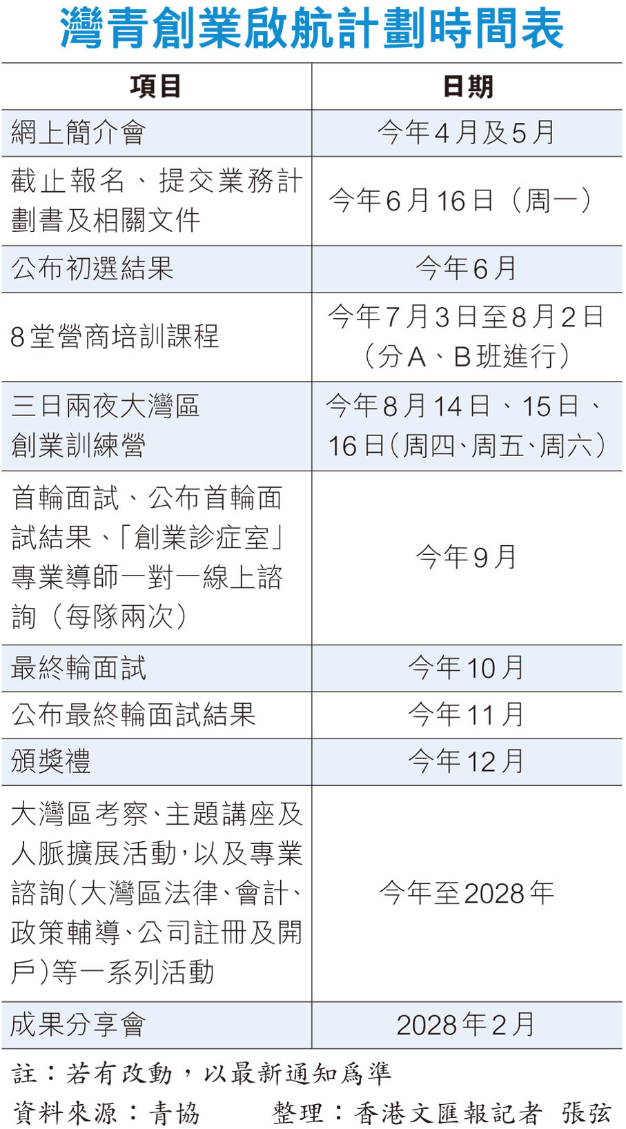 青協獲得民青局及青年發展委員會的青年發展基金轄下「民青局粵港澳大灣區青年創業資助計劃(2024-2027)」資助,繼續於今年推出粵港澳大灣區青年創業啟航計劃,並較上次計劃多支持3支隊伍,即共15支隊伍,青協希望有更多香港青年人把握機會參與今次計劃。