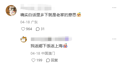 不少網友趕忙做和事佬:其實,粵語中的「鄉下」指的就是家鄉、老家,就算老家是城市,同樣也可以稱作「返鄉下」。