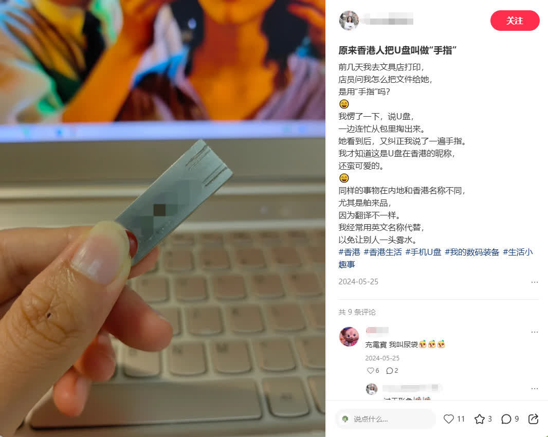 同理,U盤在香港被稱作「手指」,源於英語thumb drive。