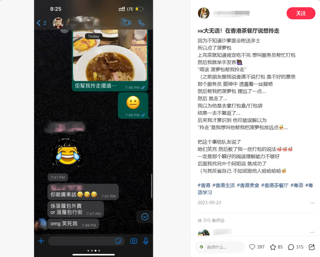 有網友表示,在香港茶餐廳吃飯,朋友提示不要說「打包」,因為老一輩香港人通常把醫院裏收屍稱作「打包」,吃飯時則通常用「拎走」、「外賣」、「行街」表示帶走餐品。