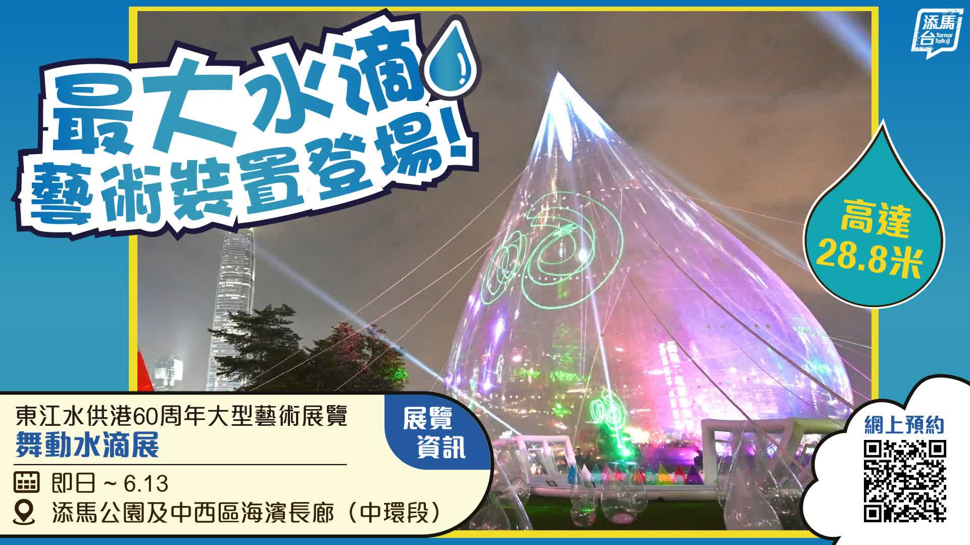 東江水供港60周年大型藝術展覽「舞動水滴展」首次展出一個高達28.8米的巨型水滴裝置,為同類展覽中歷來最大。展覽於添馬公園及中西區海濱長廊(中環段)舉行,展期至6月13日,歡迎大家到場「打卡」觀賞。
