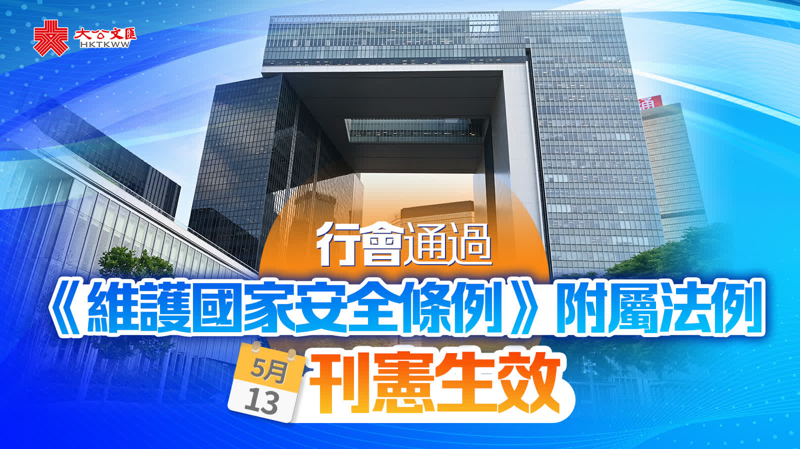 大公文匯全媒體報道,署理行政長官陳國基會同行政會議今日(13日)通過,根據《維護國家安全條例》(下稱《國安條例》)第110條訂立《維護國家安全(中央人民政府駐香港特別行政區維護國家安全公署)規例》,及根據《國安條例》第42條,由署理行政長官作出《維護國家安全(禁地宣布)令》,就香港國安法第五章關乎中央人民政府駐香港特別行政區維護國家安全公署(公署)的職責的條文訂明具體細節,兩項附屬法例於同日刊憲並即時生效。