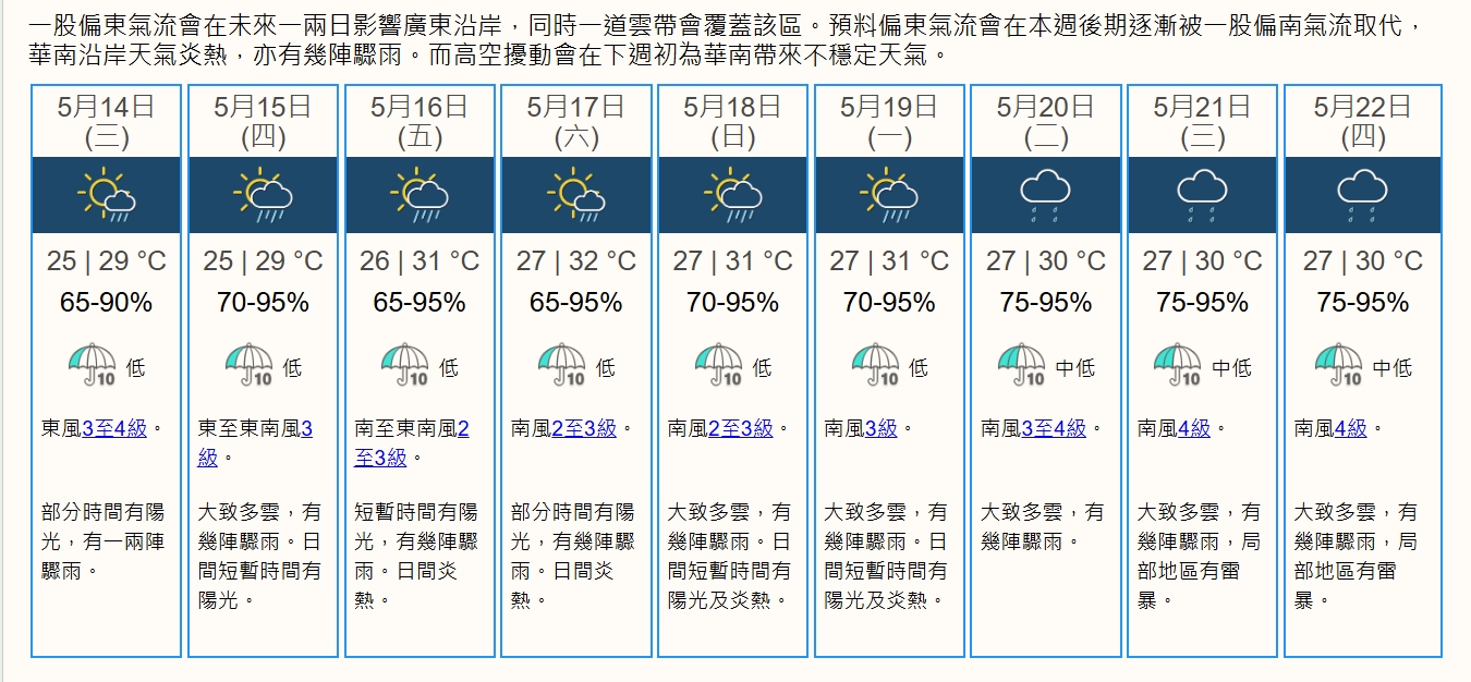 天文台指,一股偏東氣流會在未來一兩日影響廣東沿岸,同時一道雲帶會覆蓋該區。預料偏東氣流會在本周後期逐漸被一股偏南氣流取代,華南沿岸天氣炎熱,亦有幾陣驟雨。而高空擾動會在下周初為華南帶來不穩定天氣。