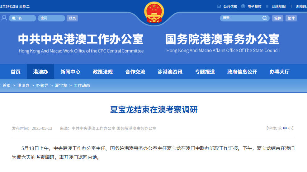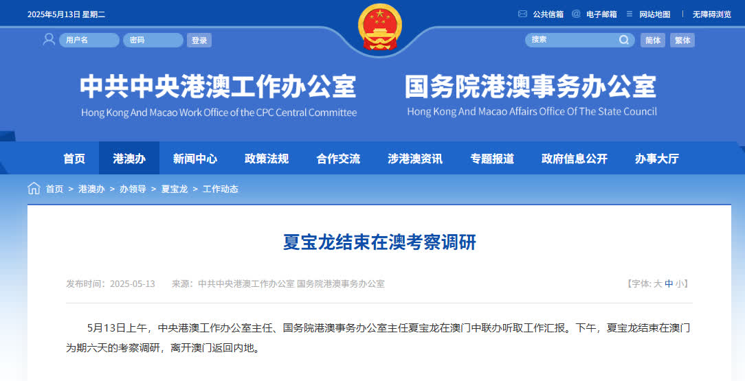 大公文匯全媒體報道,5月13日上午,中央港澳工作辦公室主任、國務院港澳事務辦公室主任夏寶龍在澳門中聯辦聽取工作匯報。下午,夏寶龍結束在澳門為期六天的考察調研,離開澳門返回內地。