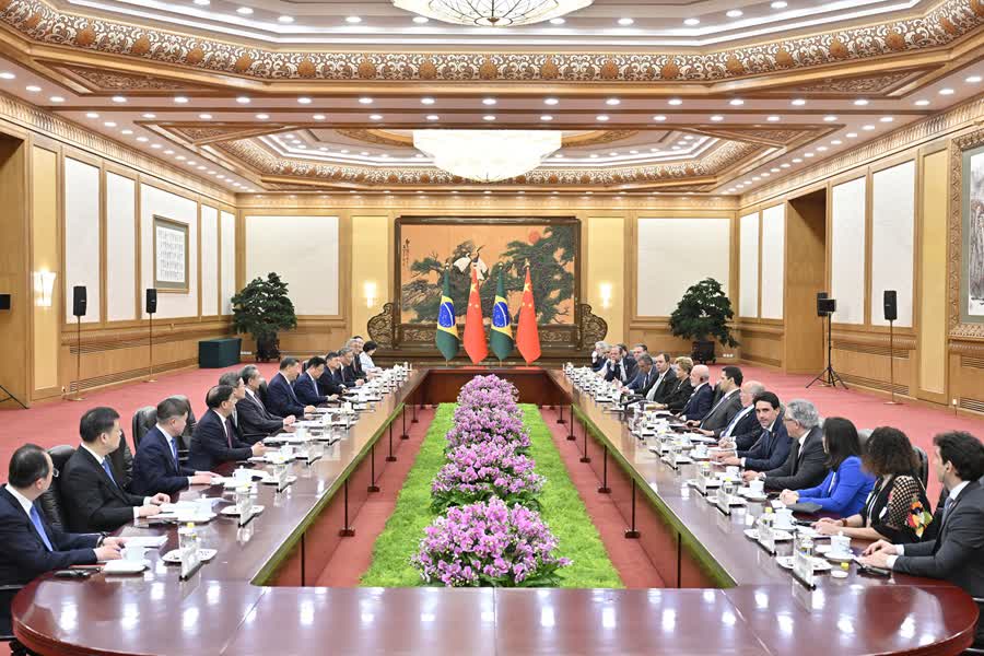 據新華社報道,5月13日下午,國家主席習近平在北京人民大會堂同來華進行國事訪問的巴西總統盧拉舉行會談。