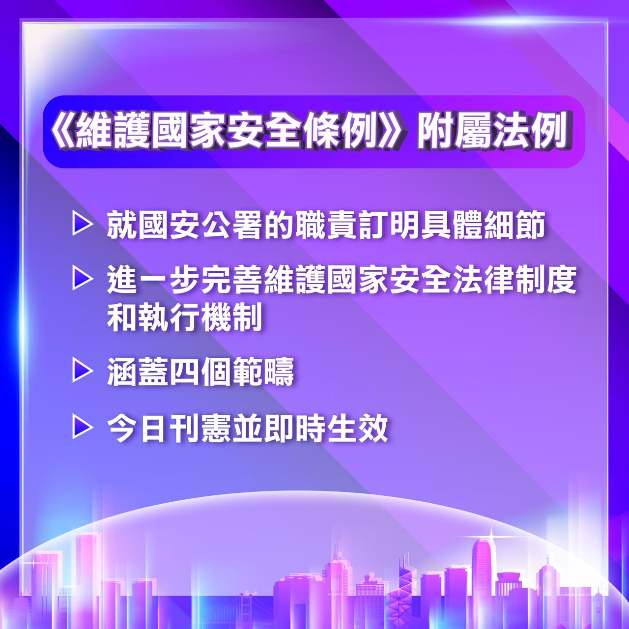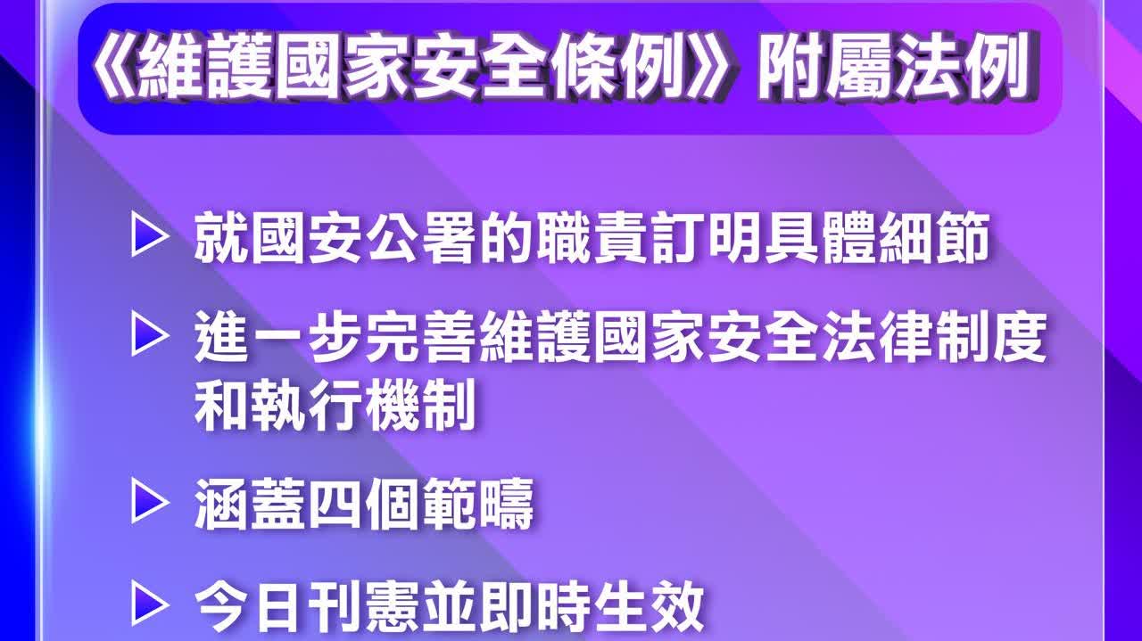 《維護國家安全條例》關乎國家安全公署(公署)的職責及宣布公署的履職場所為禁地的兩項附屬法例今日刊憲並即時生效,並會在立法會進行「先訂立,後審議」程序。