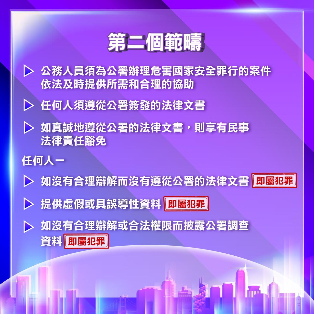 2. 訂明公署在三種特定情況出現時,包括(i)案件涉及外國或者境外勢力介入的複雜情況,香港特區管轄確有困難的;(ii)出現特區政府無法有效執行《香港國安法》的嚴重情況的;或(iii)出現國家安全面臨重大現實威脅的情況的,就涉及《香港國安法》規定的四類危害國家安全罪行的案件(即分裂國家罪、顛覆國家政權罪、恐怖活動罪以及勾結外國或境外勢力危害國家安全罪)行使管轄權的執行細節,包括公務人員須及時向公署提供一切所需和合理的協助。當中並訂明任何人如沒有合理辯解而沒有遵從公署根據《香港國安法》第五十七條簽發的法律文書、提供虛假或具誤導性資料、或披露公署調查資料等,即屬犯罪。而任何人如真誠地遵從公署的法律文書,則享有民事法律責任豁免等;