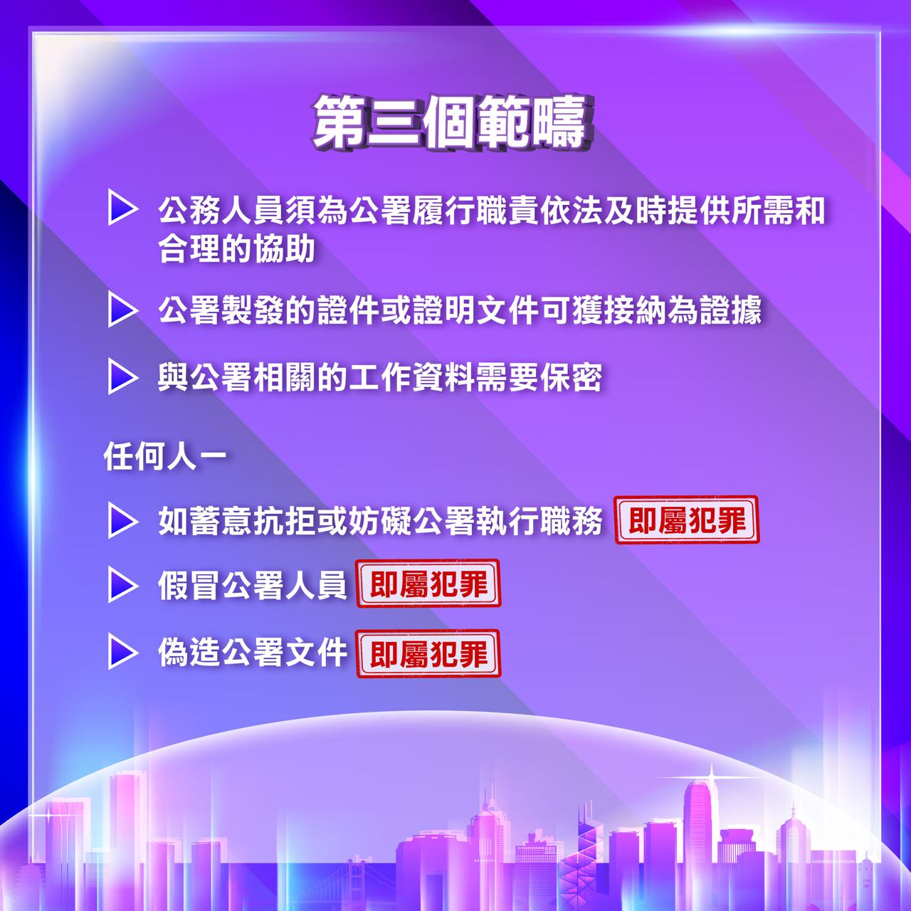 3. 就《香港國安法》中保障公署及其人員履行職責的條文作出規定,並訂明相關罪行,包括蓄意抗拒或妨礙公署執行職務、假冒公署人員及偽造公署文件等。而政府及公務人員須依法及時提供協助及便利等;