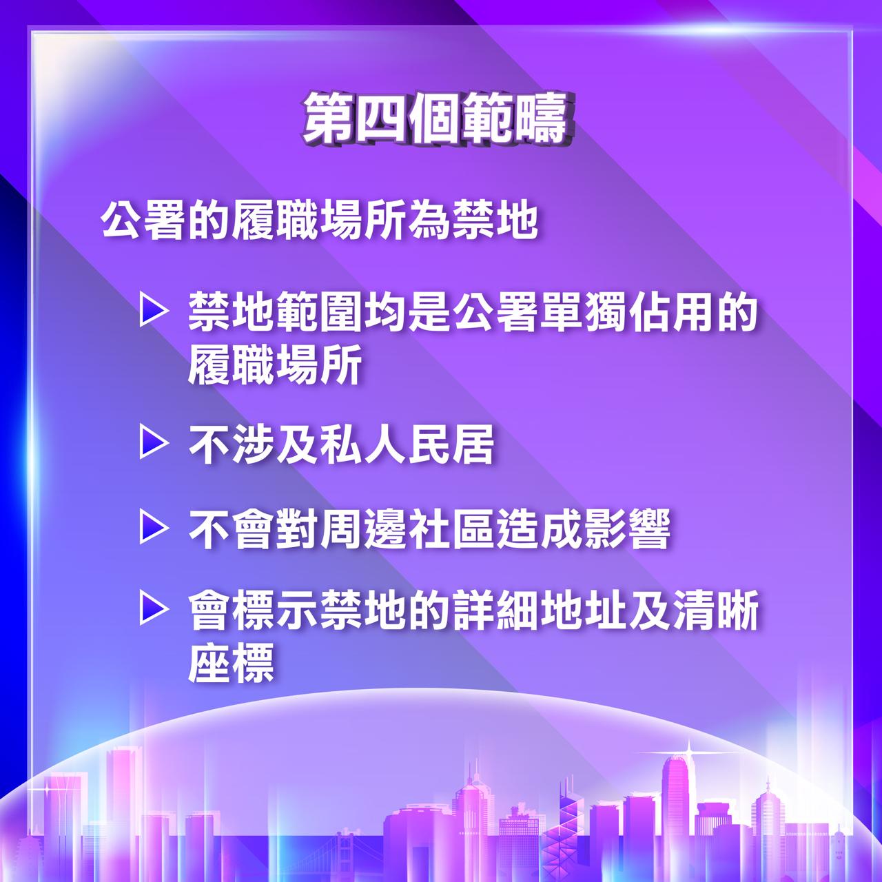 4. 宣布國安公署的履職場所為禁地,特區政府會在附屬法例中標示有關禁地的詳細地址及連結起來能清楚界定整個禁地範圍的各點的清晰座標。。禁地不涉及私人民居,也不會對周邊社區造成不合理的影響。