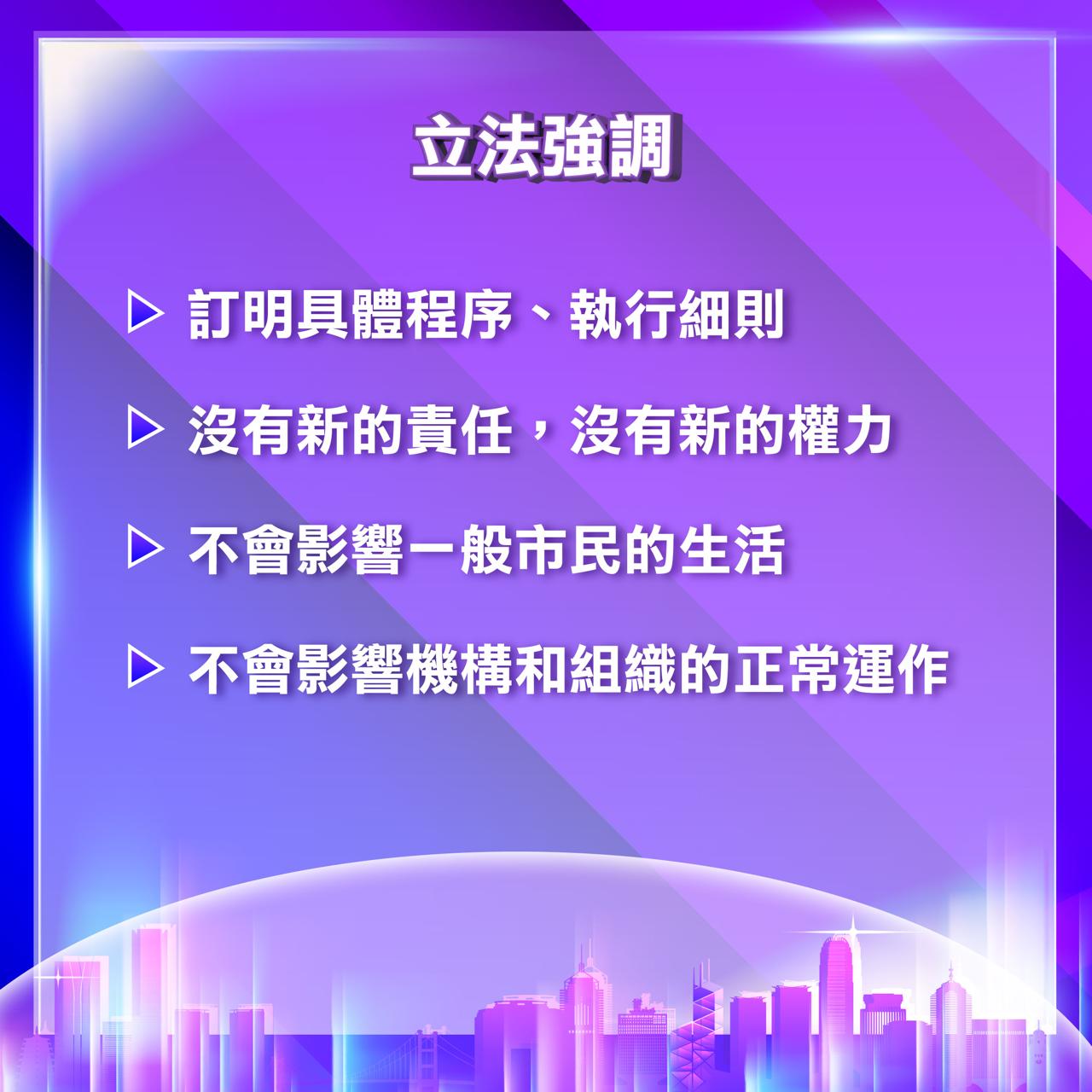 我想強調,兩項附屬法例旨在進一步完善維護國家安全的法律制度和執行機制,當中沒有賦予公署新權力,不會影響一般市民的生活,亦不會影響機構和組織的正常運作。