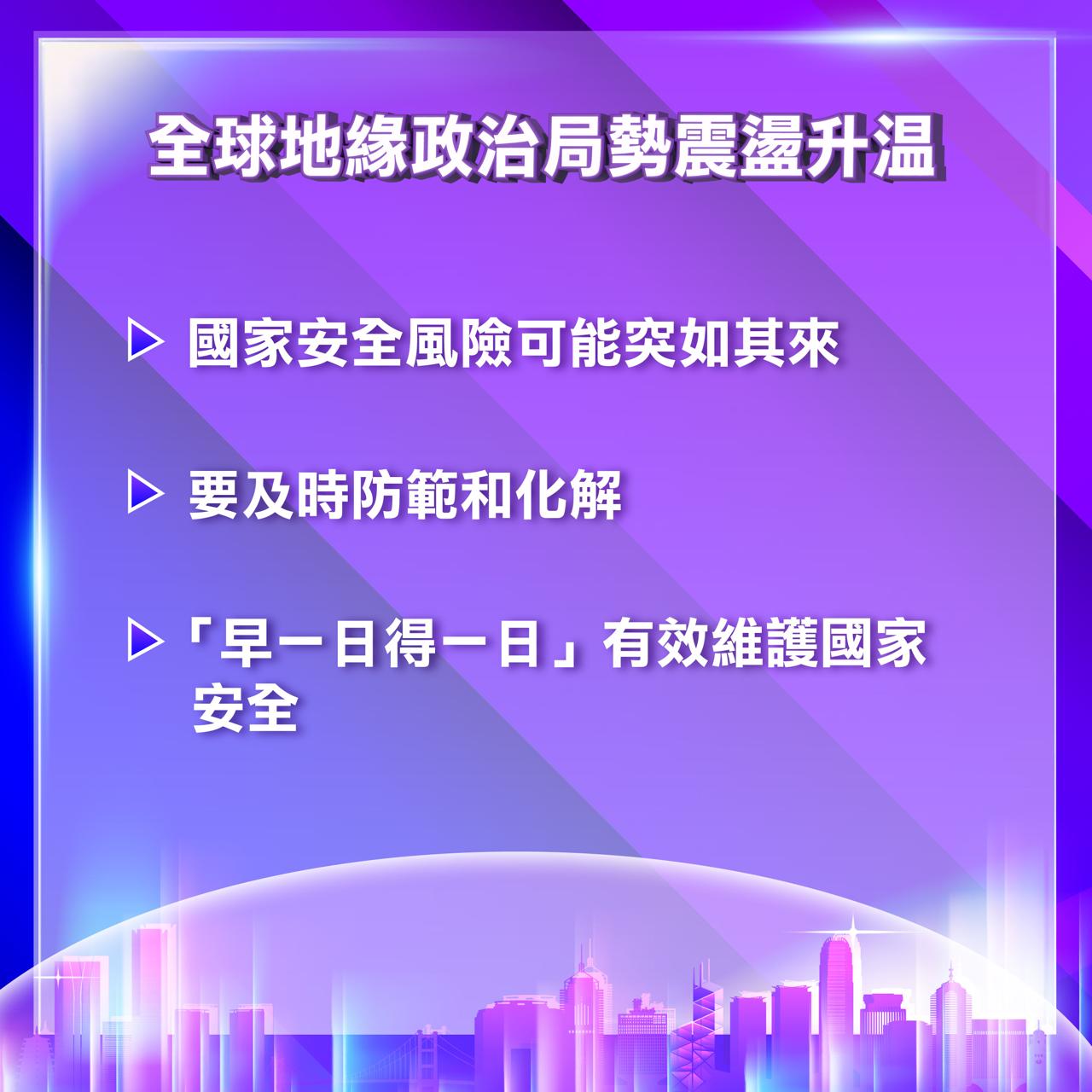 全球地緣政治局勢震盪升溫,香港面對的國家安全風險可能突如其來。因此,特區政府必須居安思危,「早一日 得一日」及早制訂全面的維護國家安全措施,以更有效實施維護國家安全的機制,及時防範和化解可能出現的國家安全風險。