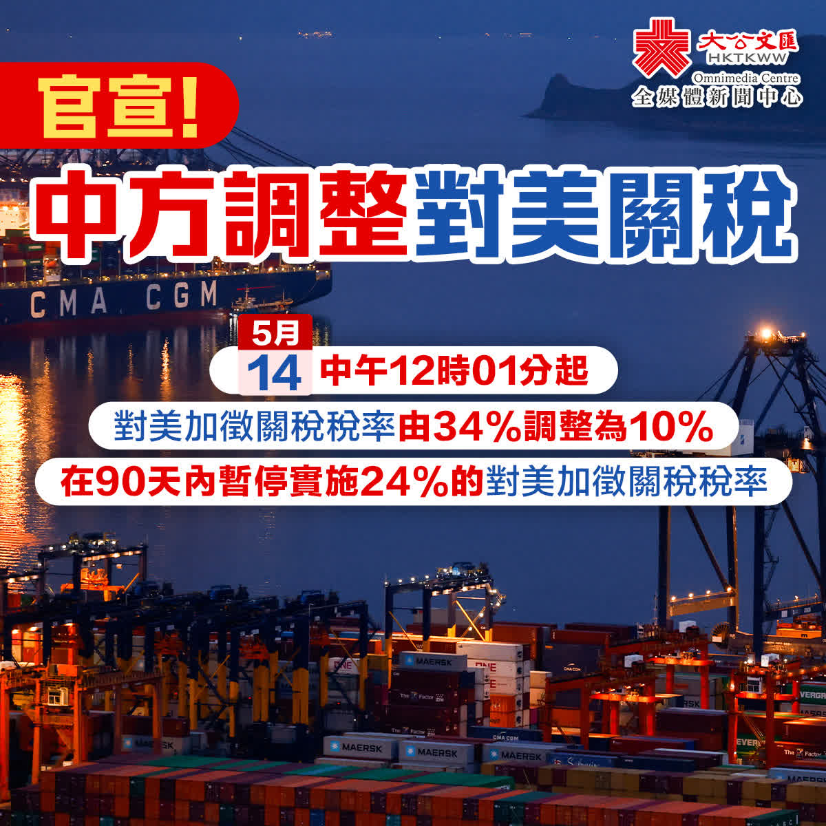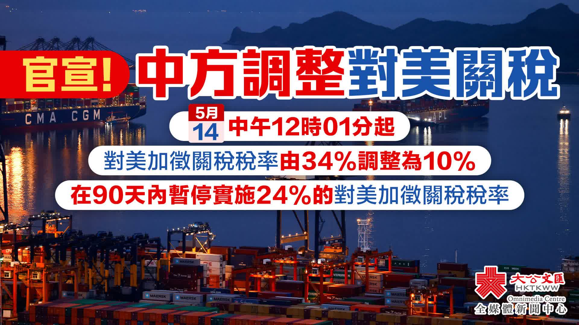 一、調整《國務院關稅稅則委員會關於對原產於美國的進口商品加徵關稅的公告》(稅委會公告2025年第4號)規定的加徵關稅稅率,由34%調整為10%,在90天內暫停實施24%的對美加徵關稅稅率。
