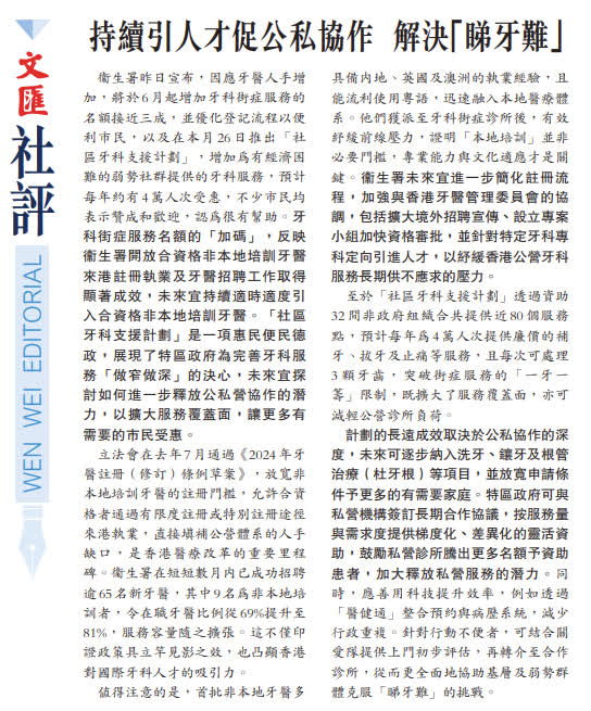 衞生署昨日宣布,因應牙醫人手增加,將於6月起增加牙科街症服務的名額接近三成,並優化登記流程以便利市民,以及在本月26日推出「社區牙科支援計劃」,增加為有經濟困難的弱勢社群提供的牙科服務,預計每年約有4萬人次受惠,不少市民均表示贊成和歡迎,認為很有幫助。牙科街症服務名額的「加碼」,反映衞生署開放合資格非本地培訓牙醫來港註冊執業及牙醫招聘工作取得顯著成效,未來宜持續適時適度引入合資格非本地培訓牙醫。「社區牙科支援計劃」是一項惠民便民德政,展現了特區政府為完善牙科服務「做窄做深」的決心,未來宜探討如何進一步釋放公私營協作的潛力,以擴大服務覆蓋面,讓更多有需要的市民受惠。