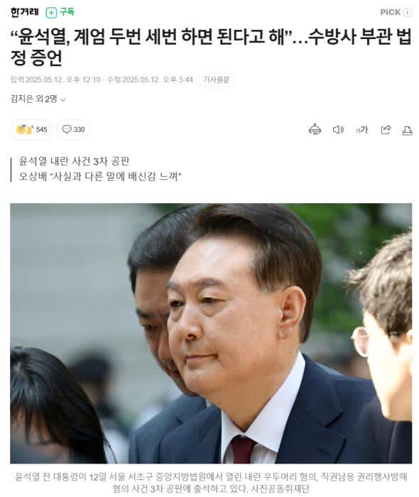 據《韓民族新聞》報道,當地時間5月12日,韓國首爾中央地方法院對前總統尹錫悅涉嫌內亂頭目罪舉行第三次庭審。韓軍首都防衛司令部副官吳尚培(音)出庭作證時表示,自己曾在2024年12月4日凌晨聽到尹錫悅說,哪怕國會通過解除戒嚴的決議案,他也可以宣布第二次、第三次戒嚴。