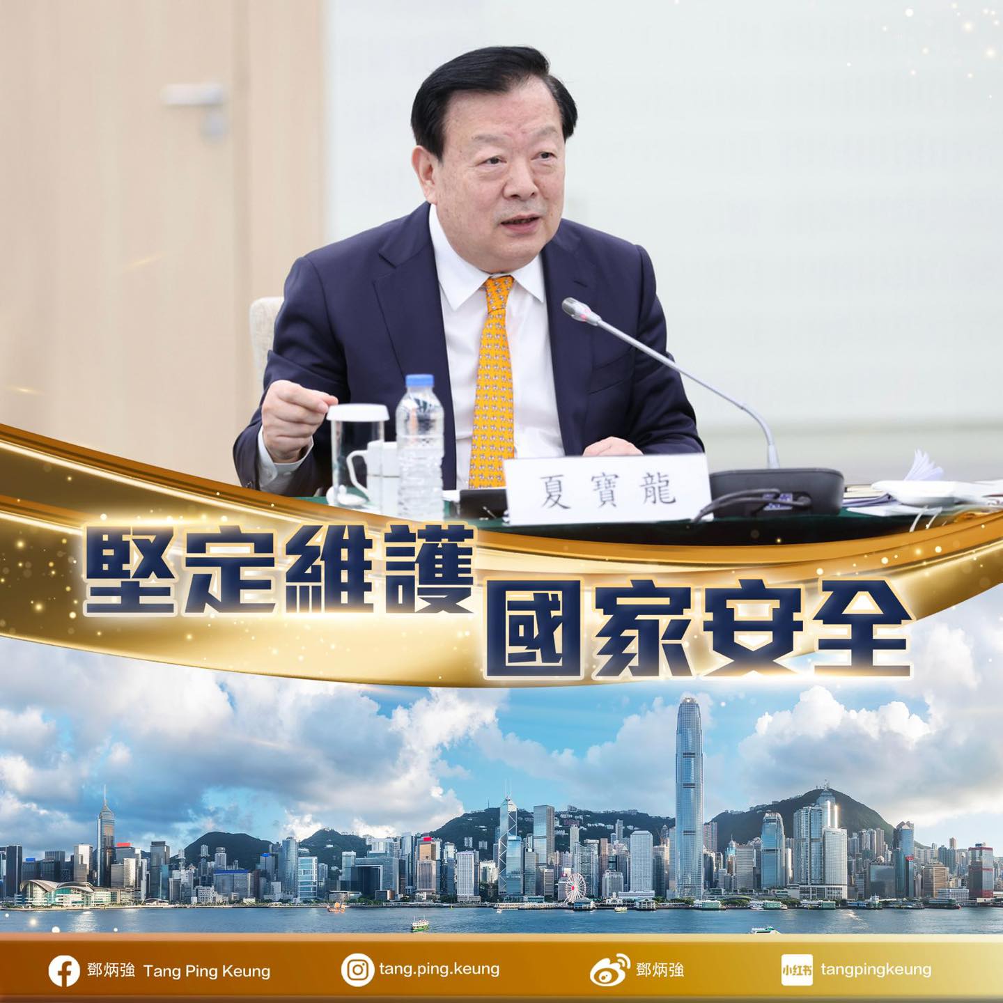 鄧炳強表示,夏主任再次提醒面對複雜兇險的國際地緣政治格局,社會各界必須團結一致,堅守國家利益底線,只有堅决鬥爭才能贏得尊嚴、求得發展。越是風高浪急,港澳各界越要勇敢擔起新時代「一國兩制」實踐的重要使命,以港澳為家、倚港澳興業,積極發揮優勢,對外開放,用更有力的實際行動建設港澳、貢獻國家,向世界說好港澳齊心協力推動國家高質量發展的中國故事。