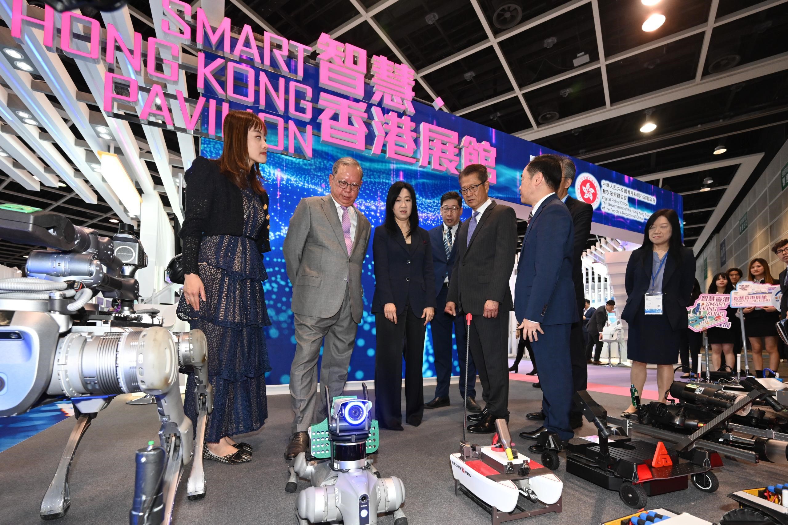「智慧市民」:展出建築署的「爬壁機器人」,能靈活攀附樓宇外牆,高效準確地進行外牆檢測;渠務署的「不倒翁」球形地下管道檢測機械人,透過360度全景拍攝及人工智能技術監察管道狀況,並榮獲2024日內瓦國際發明展金獎;以及路政署使用地理空間和人工智能的技術,能自動識別道路設施和繪製測量圖,提升道路工程效率。