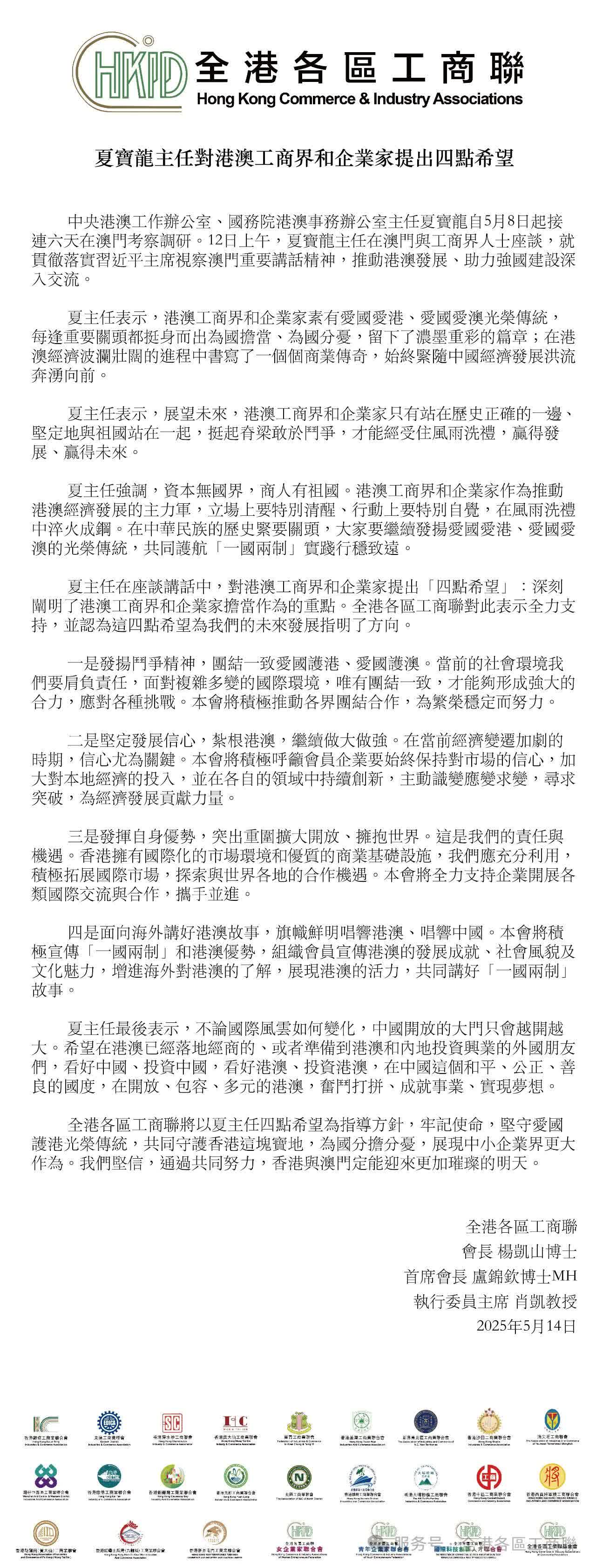 夏主任在座談講話中,對港澳工商界和企業家提出「四點希望」:深刻闡明了港澳工商界和企業家擔當作為的重點。全港各區工商聯對此表示全力支持,並認為這四點希望為我們的未來發展指明了方向。