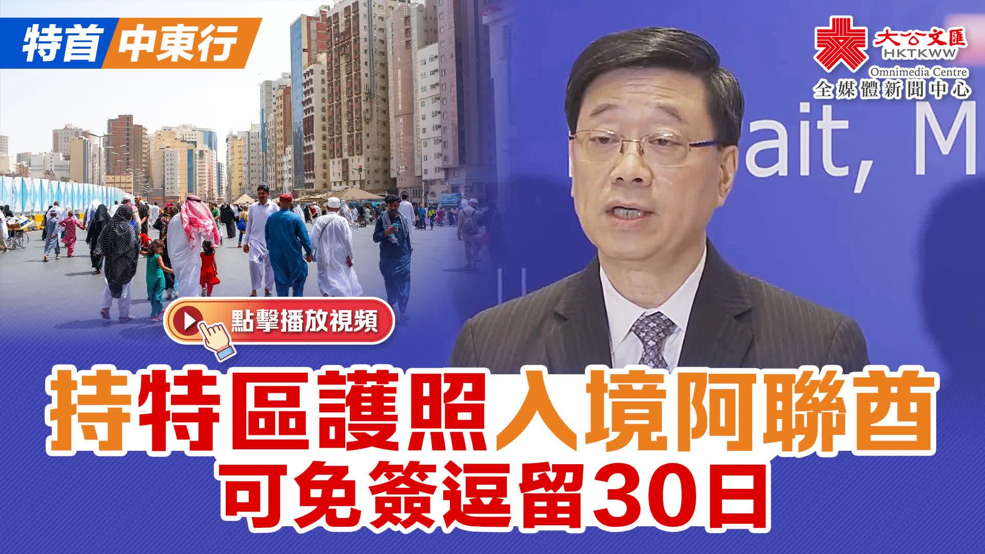 大公文匯全媒體報道,行政長官李家超率團訪問中東行程接近尾聲,他今日(14日)在科威特見記者總結行程,形容此行成功,並公布由明日起,持香港特區護照可免簽證入境阿聯酋30日,並將免簽入境阿曼的最長逗留時間由10日延長至14日,促進雙邊交流。