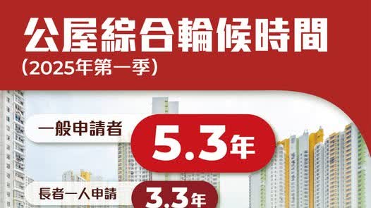 大公文匯全媒體報道,房委會最新數據顯示,截至今年3月底,過去12個月獲安排入住公屋的一般公屋申請者平均輪候時間維持在5.3年,而長者一人申請者的輪候時間較上一季,則回落0.1年至3.3年。