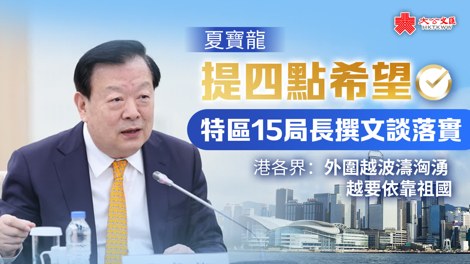 香港特區政府15位局長撰文表示,夏主任的四點希望對香港意義重大,夏主任指出,「資本無國界,商人有祖國」,社會各界應該團結一心,堅守國家利益底線,發揮自身優勢,在變局中開創新局,為香港繁榮穩定和國家富強貢獻力量。局長們表示,政府會發揮好「一國兩制」下「內聯外通」的獨特優勢,因地制宜發展新質生產力。