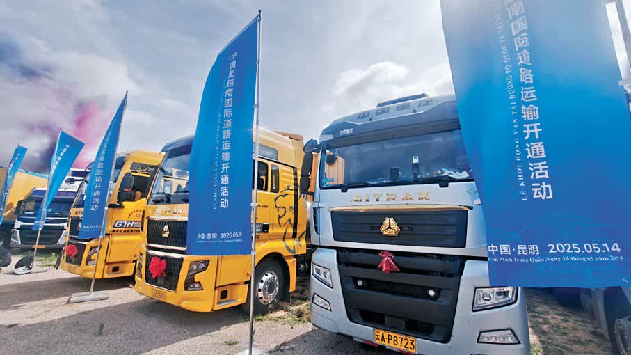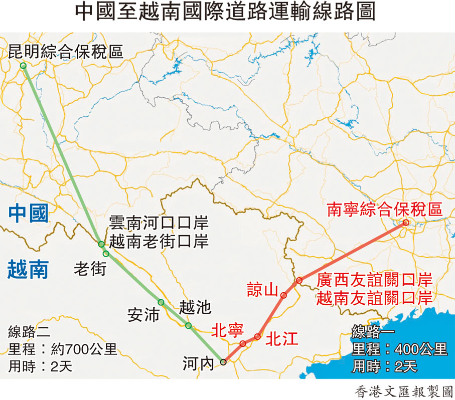 (香港文匯報 記者 蘇徵兵、葛沖)5月14日上午10:40,隨着發車指令聲響,搭載着電子元器件、新鮮蔬菜、百貨的運輸車隊從廣西南寧、雲南昆明同時發車,向越南河內駛去,標誌着中國至越南河內國際道路運輸線路開通,中方貨運車輛持CBTA(Greater Mekong Subregion Cross-Border Transport Facilitation Agreement,大湄公河次區域便利貨物及人員跨境運輸協定)證件首次入境越南腹地,進一步提升了中越國際道路運輸便利化水平。