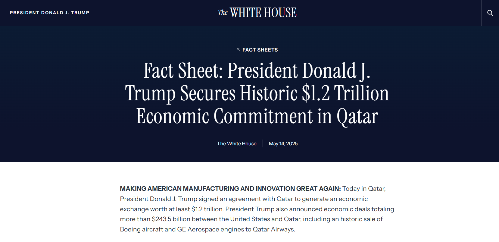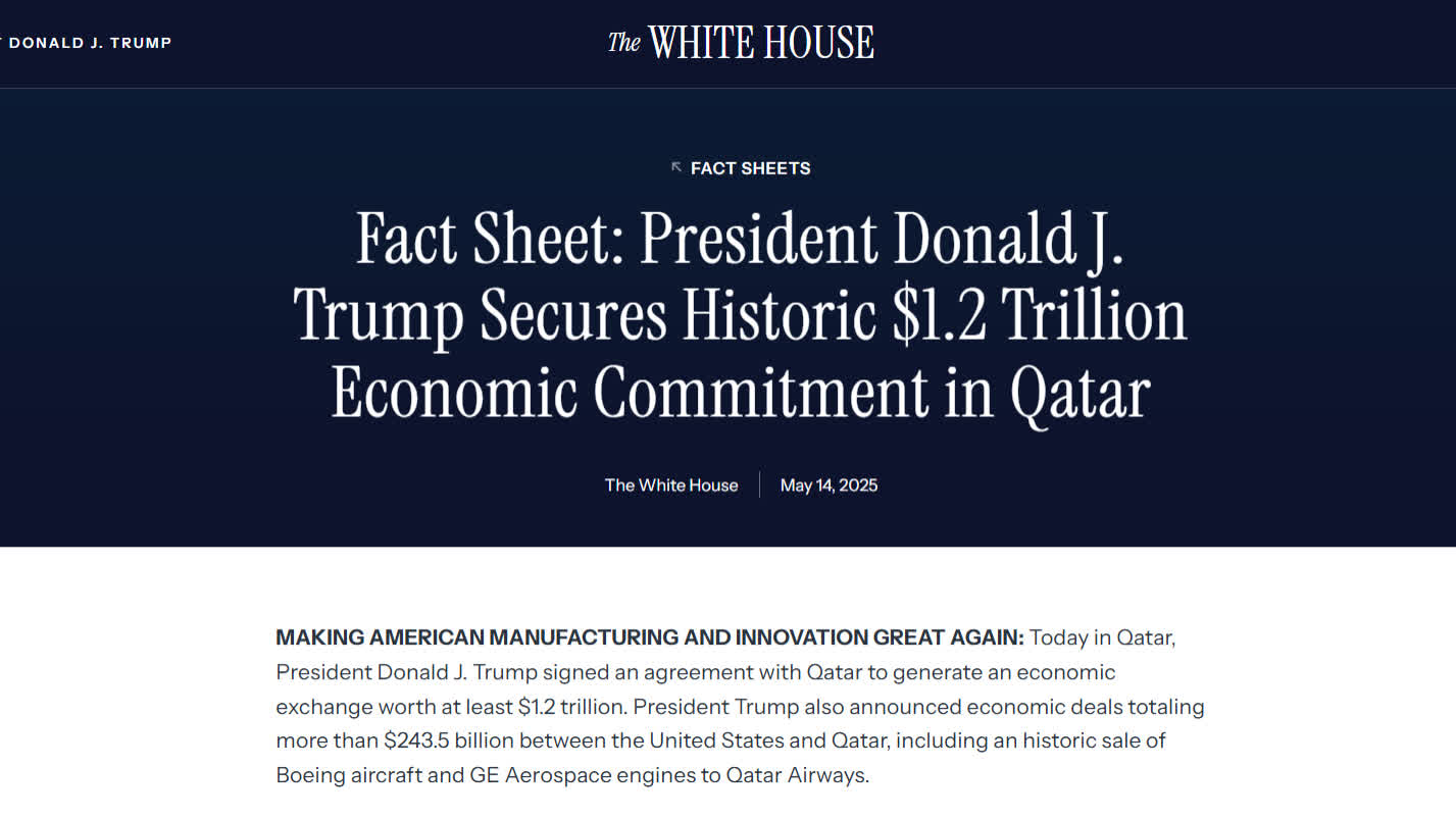 白宮表示,卡塔爾航空與波音公司、通用電氣航空航天公司簽署了一項高達960億美元(約7488億港元)的合同,購買210架波音787「夢想客機」和波音777X客機。白宮稱這是波音歷來最大的寬體飛機及787飛機訂單。