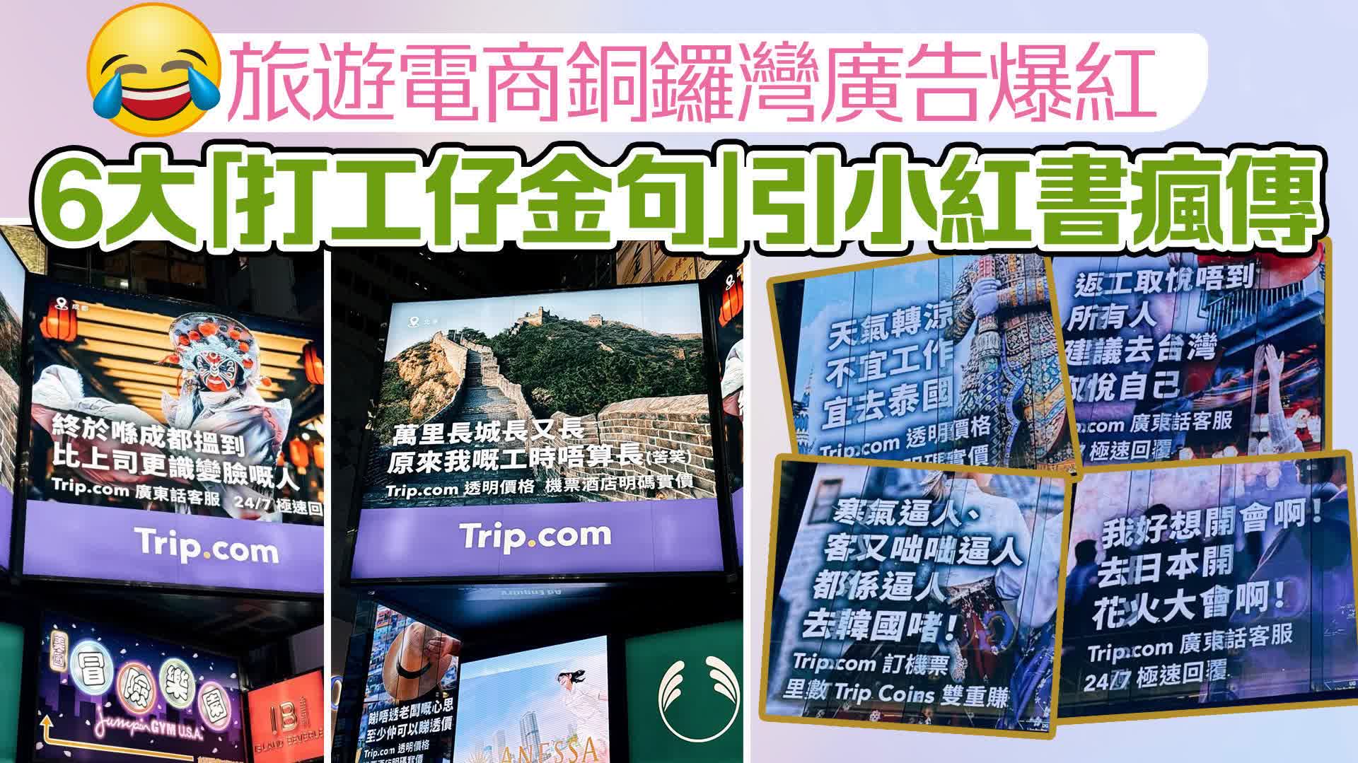 大公文匯全媒體報道,近日,有小紅書網民發現,位於銅鑼灣金百利中心一帶展出的姜濤生日應援廣告牌,已被換成了旅遊電商平台Trip.com的大型廣告。廣告一共展出了6條「金句」,公然寸爆香港老闆及職場文化,讓不少網民大讚「好盞鬼」。
