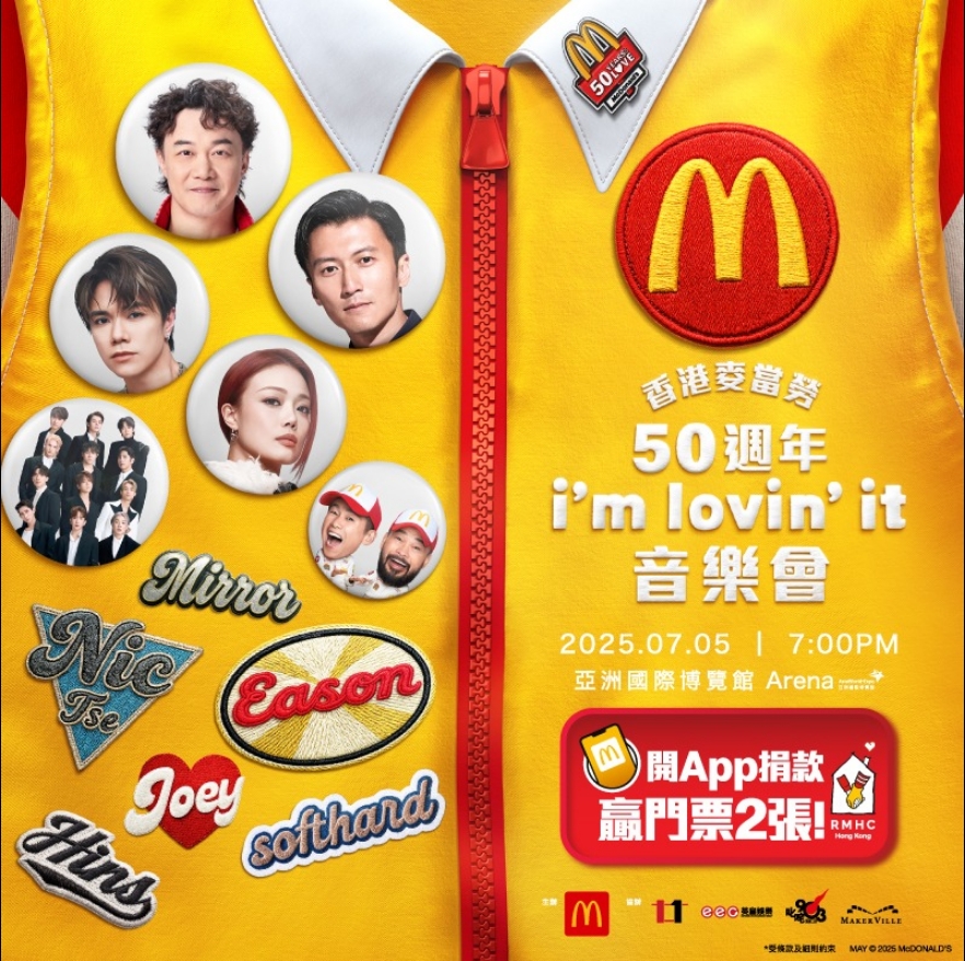 大公文匯全媒體報道,香港麥當勞為慶祝50周年,將於7月5日在亞博舉行超盛大生日會《香港麥當勞50周年i'm lovin' it音樂會》,雲集陳奕迅、謝霆鋒、容祖兒、張敬軒、軟硬及MIRROR等巨星!粉絲只要在麥當勞App內捐款參加抽獎,便有機會贏取門票兩張。