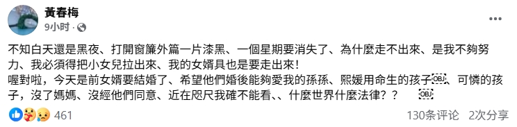 S媽還提到前女婿汪小菲明天(17日)即將結婚,「希望他們婚後能夠愛我的孫孫、熙媛用命生的孩子。沒經他們同意,(孩子)近在咫尺我卻不能看。」