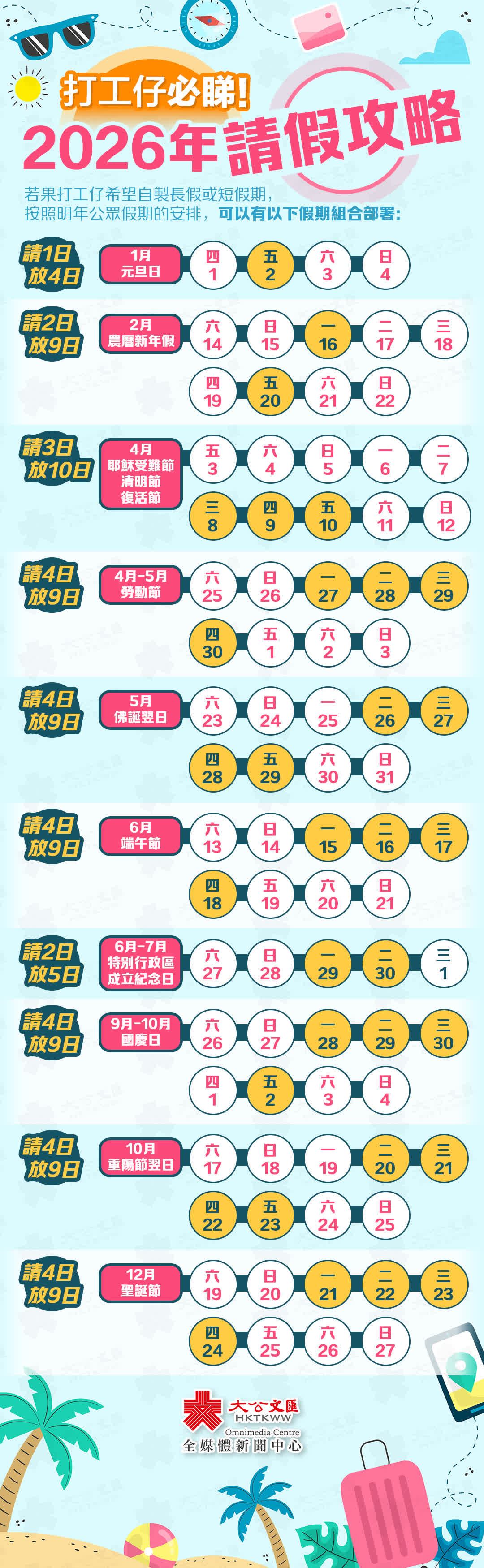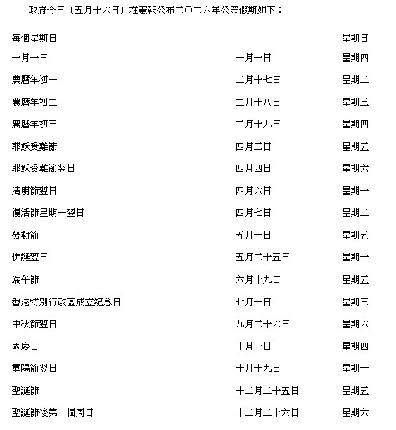 大公文匯全媒體報道,政府今日(16日)公布2026年公眾假期。
