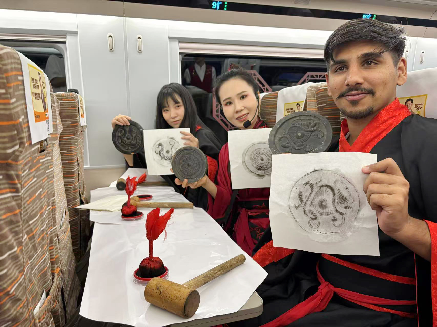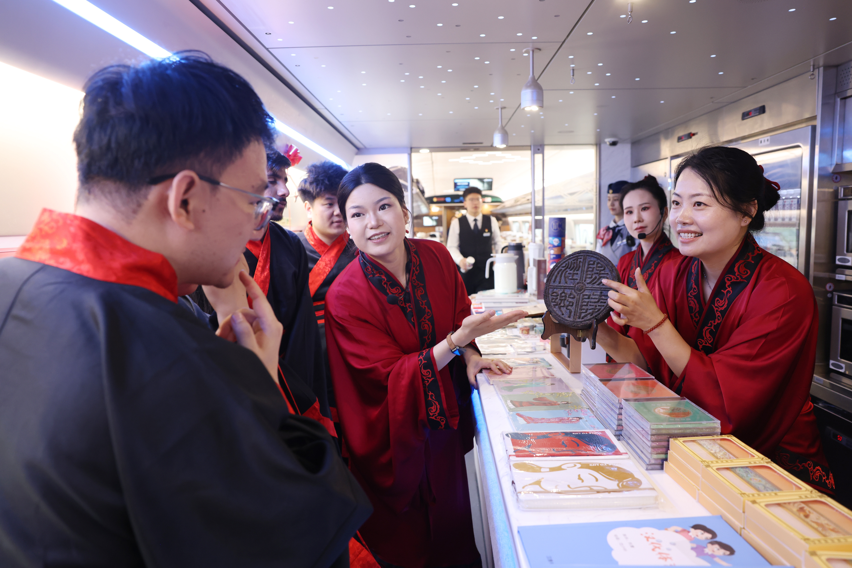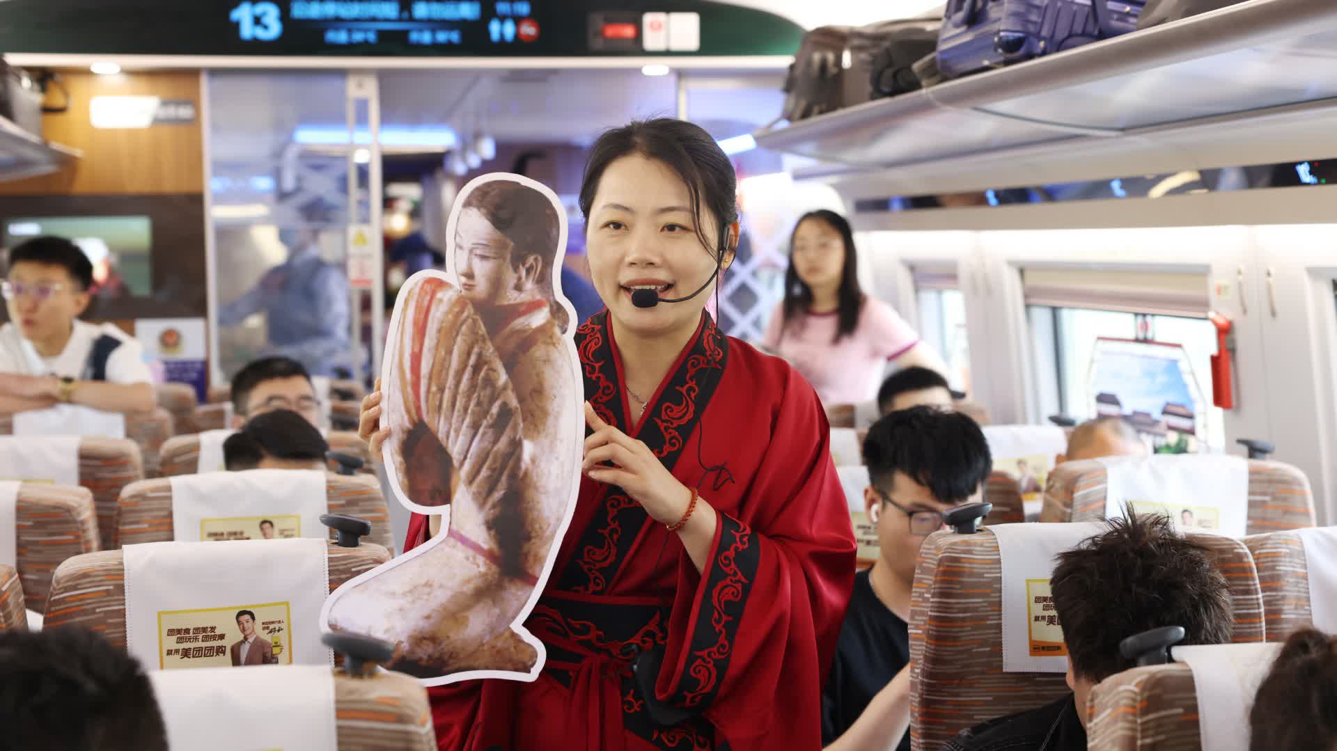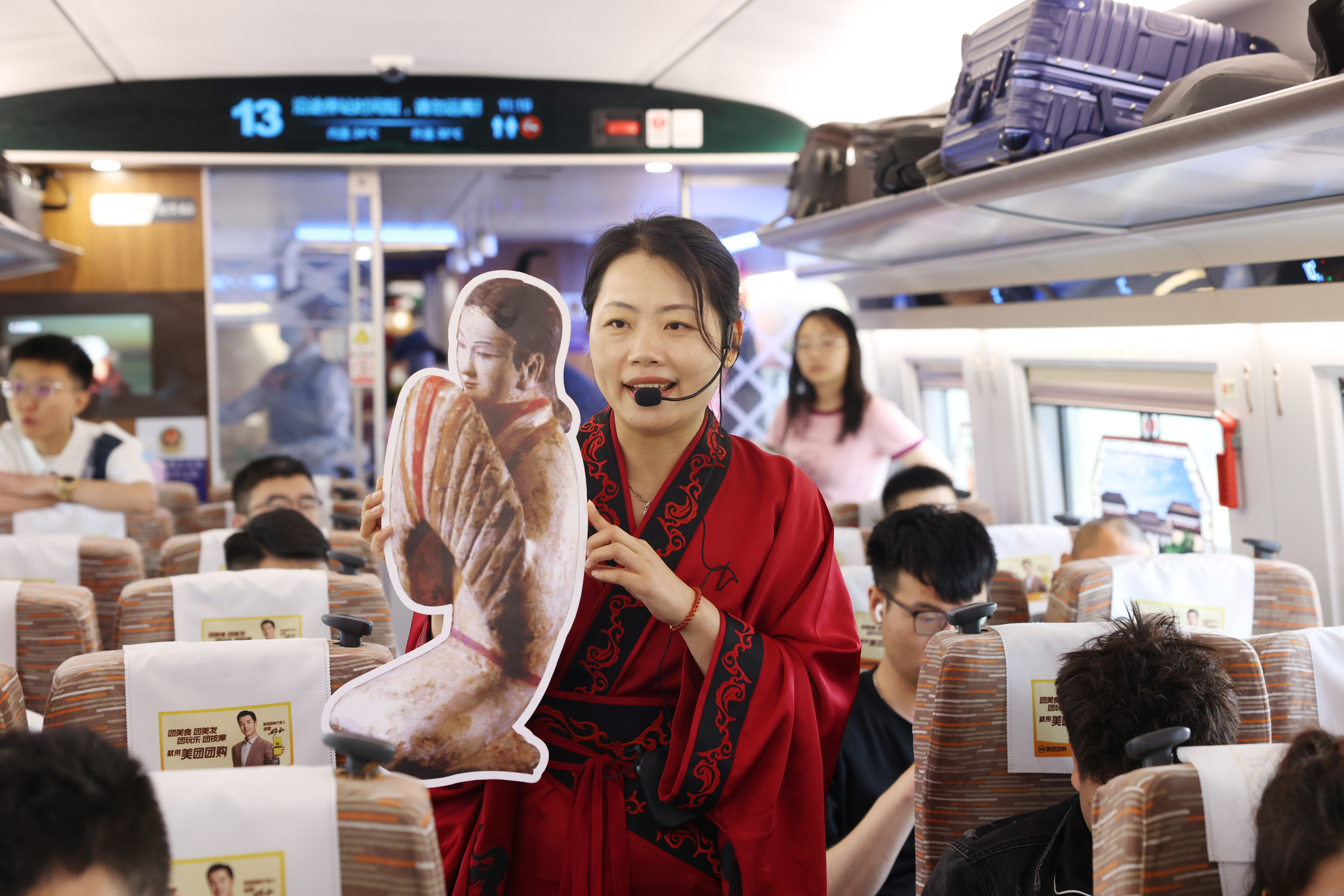 「以前總聽到文景之治,沒想到背後竟然有這麼多的故事。」旅客王先生告訴記者,以往長距離旅途中,自己不是刷手機就是睡覺,而今天這趟列車,卻給了他一個全新的旅程和體驗。「僅僅一個多小時,通過這些豐富多彩的出土文物,我不僅觸摸到一段活生生的歷史,更被博大精深的漢文化所深深震撼。」王先生亦希望未來能在更多的高鐵列車上開設「流動博物館」,讓更多的人坐着高鐵「看」歷史。