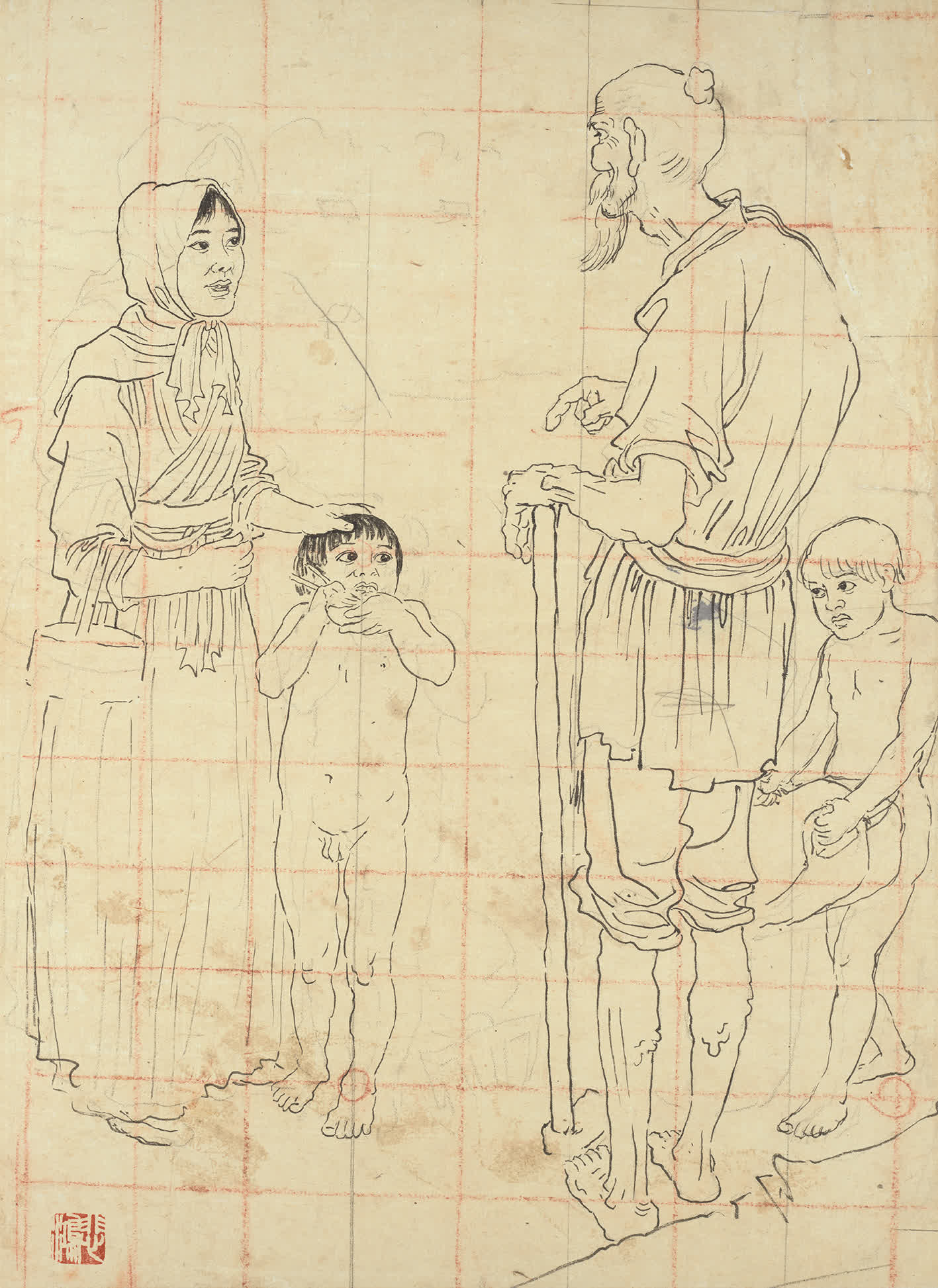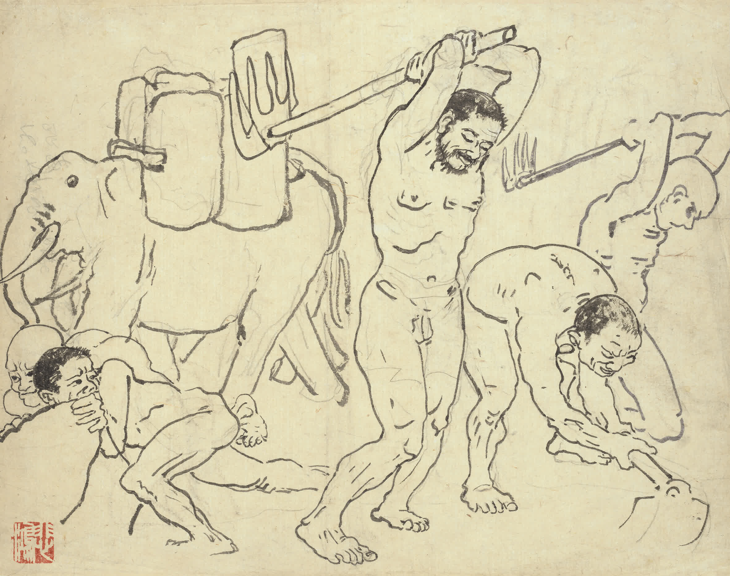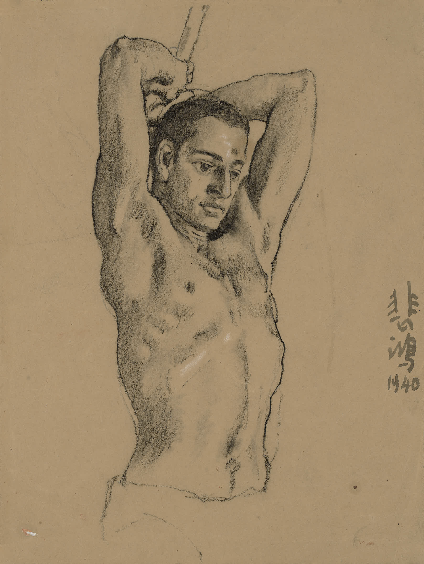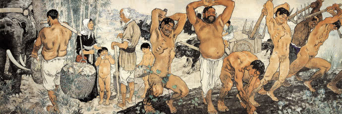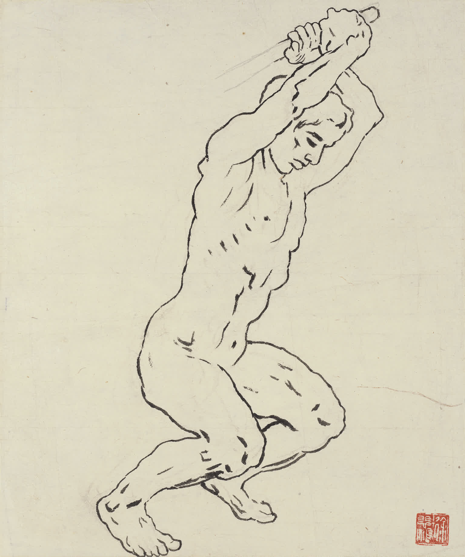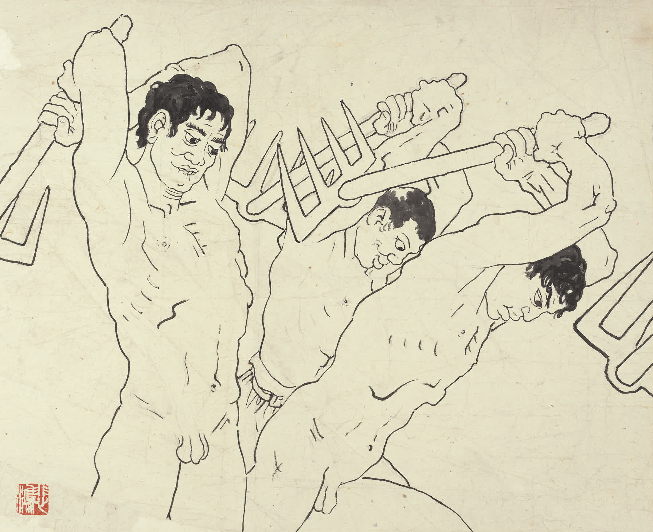 《愚公移山》最震撼之處在於其「以形寫神,融貫中西」的突破性嘗試。徐悲鴻大膽將西方寫實主義的人體解剖學與中國傳統線描技法熔於一爐:畫中人物骨骼肌肉的精準刻畫源自他在巴黎高等美院的學習積澱,而衣紋褶皺的書法性線條則繼承了任伯年、吳昌碩的筆墨精髓。