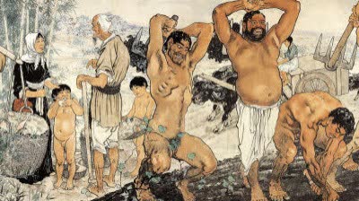 從畫面上看,《愚公移山》採用了現實主義與浪漫主義相結合的創作手法。畫作中,人物形象鮮明,肌肉線條剛勁有力,充滿了力量感;在色彩運用上,以土黃色為主色調,營造出一種質朴、厚重的氛圍,與當時中國大地的苦難與堅韌相呼應;背景的處理簡潔而富有深意,遠處的村莊和勞作的人群,暗示着這不僅僅是個人的奮鬥,而是整個民族為了生存和未來而進行的抗爭。