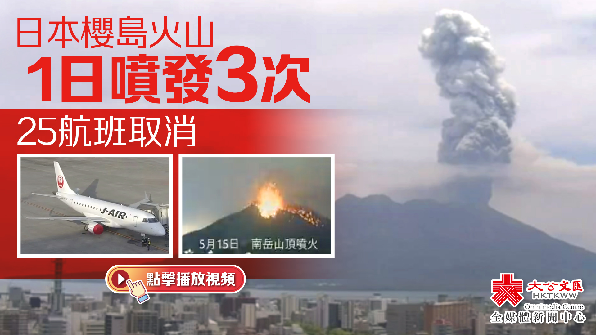 大公文匯全媒體報道,位於日本九州鹿兒島縣的櫻島火山5月15至16日連續多次爆發,火山灰最高衝上3000米高空。據日媒報道,有25個在鹿兒島機場起飛和降落的航班取消。