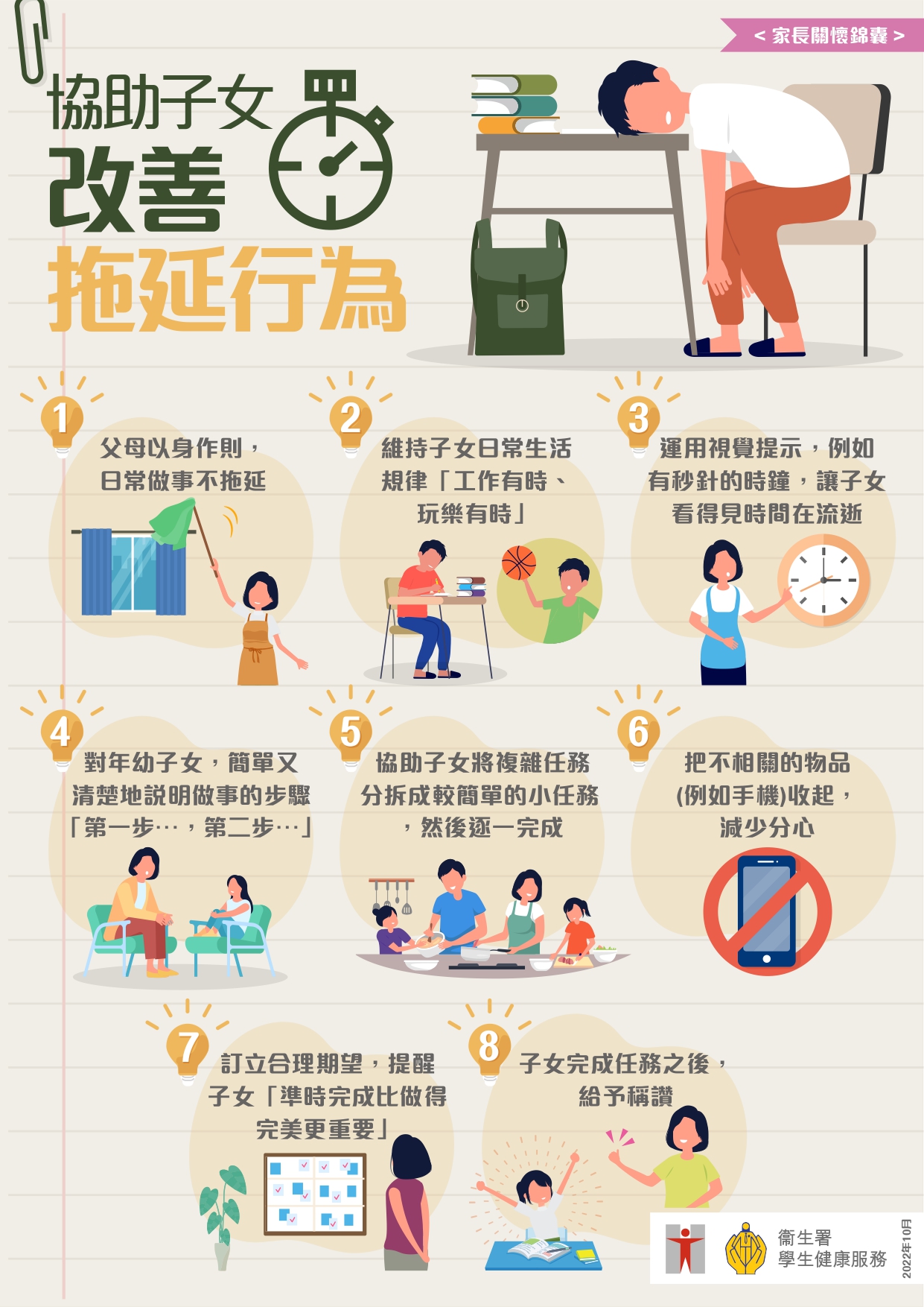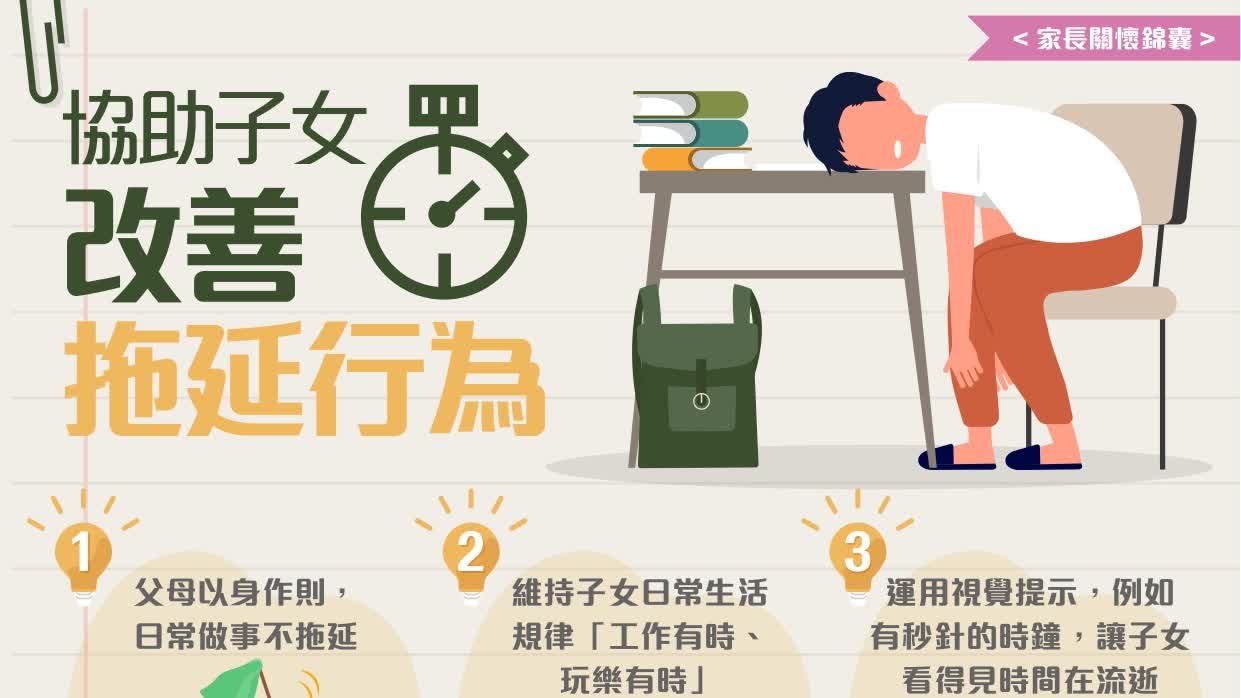 建議處理對策:家長可鼓勵子女通過訓練提升執行功能,例如將複雜及耗時的工作,分拆成幾個較易處理的小工序,每次專注完成其中一項,並養成多用鐘錶的習慣,增強時間觀念。另外,充足的睡眠對兒童及青少年的精神健康十分重要,切勿因「做事速度慢」而犧牲睡眠時間來完成工作。