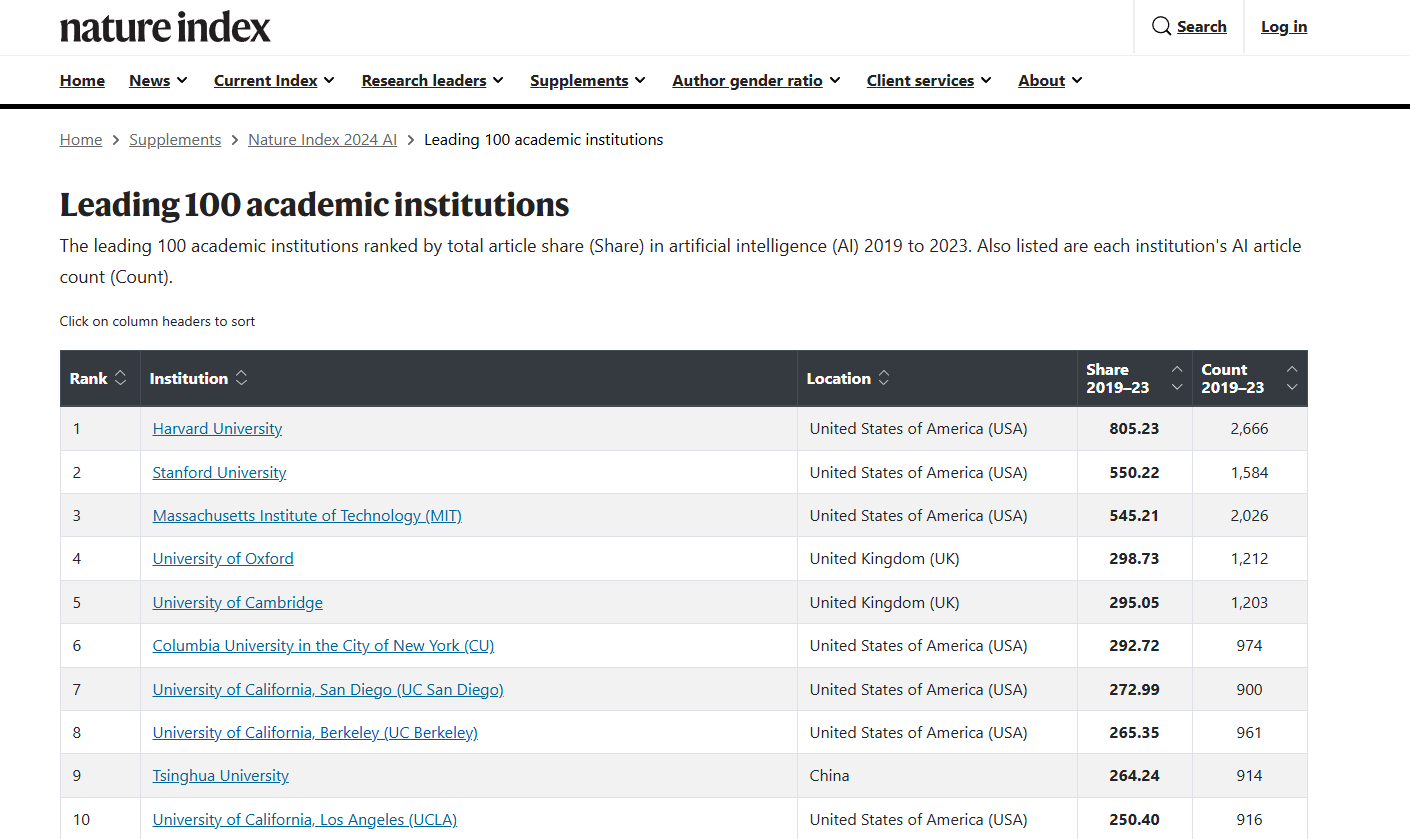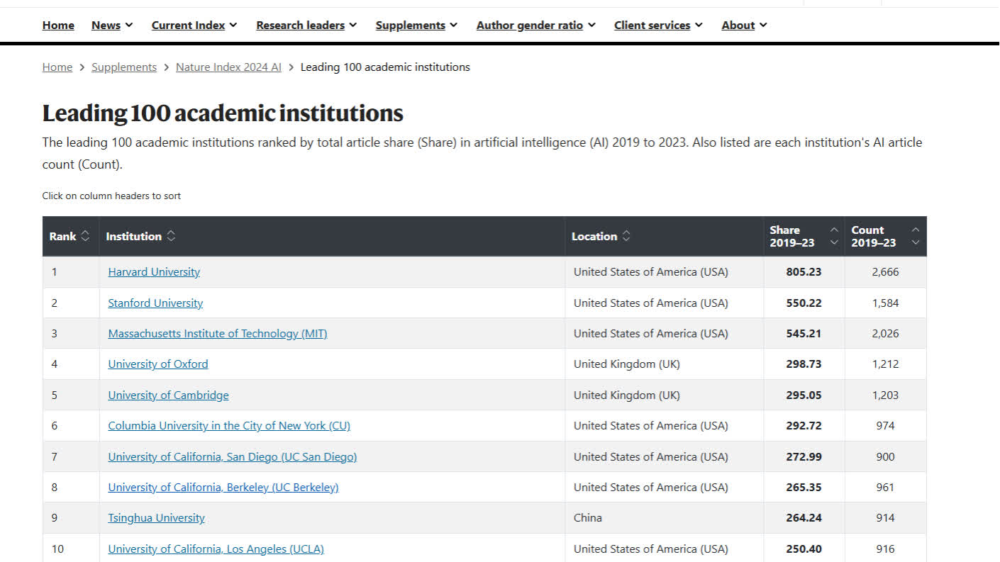 大公文匯全媒體報道,權威科學期刊《Nature》旗下的「Nature Index Supplements 2024 AI」基於過去5年頂尖期刊論文產出,日前發布全球AI研究領域領先的百強大學榜名單。其中,清華大學首次躋身前9,本港亦有兩所高校入選,包括排名第85位的香港大學和排名第88位的香港中文大學。