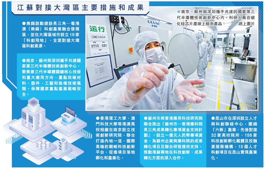 南京、蘇州與深圳攜手共建國家第三代半導體技術創新中心。去年10月和11月,江蘇昆山市先後在香港和深圳舉行經貿和科創交流活動。昆山市與香港企業簽約項目22個,涉及電子信息、智能製造、國際貿易、現代金融等重點產業領域,實現總投資超120億元。在深圳的活動上,又有49個大灣區項目簽約落地昆山,總投資306億元。